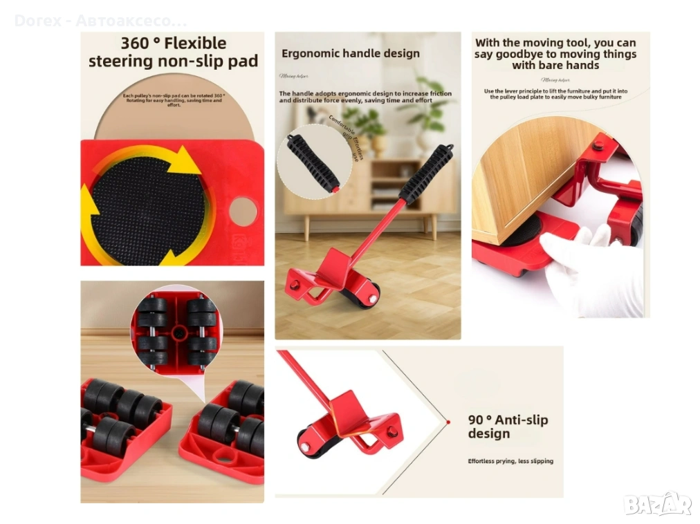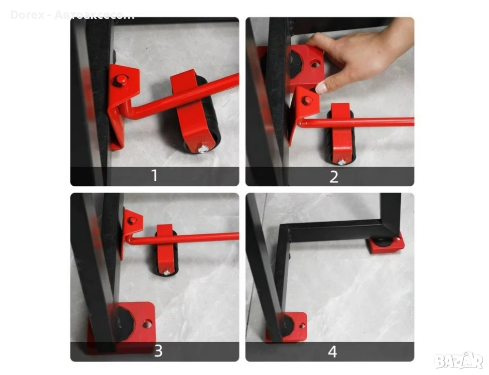 Комплектът за преместване на мебели и уреди позволява лесно, безопасно и бързо местене на тежки предмети без чужда помощ и без риск от нараняване. Идеален за дома, офиса, пренареждане или почистване.