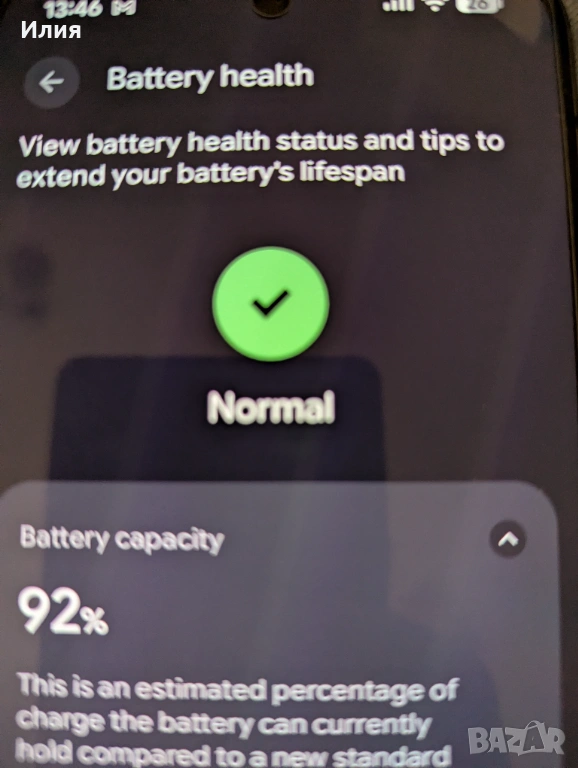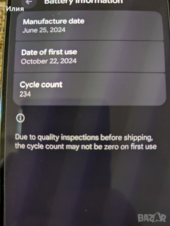 Батерията към момента на публикуване на обявата е на 234 цикъла на зареждане, battery health e 92%.
