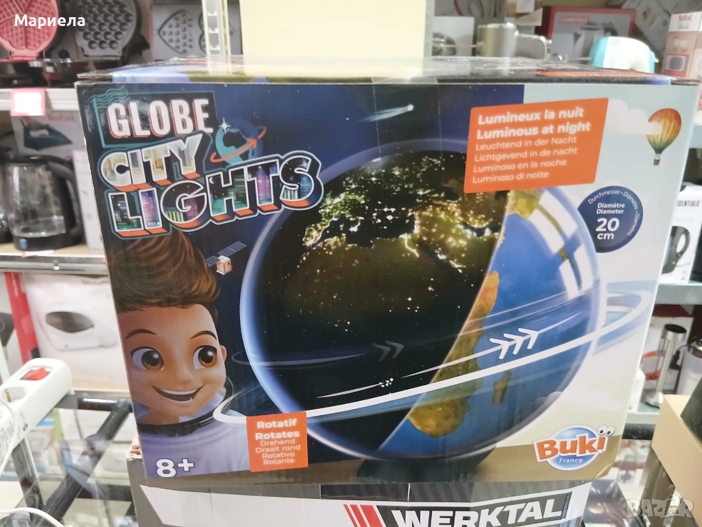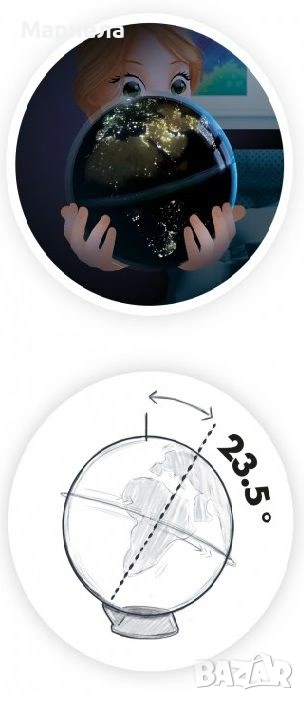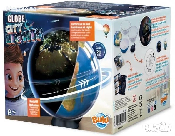 Страхотният въртящ се глобус на Buki France ще очарова всеки малък откривател. Когато неговите две части бъдат сглобени, играта може да започне. През деня може да откривате континентите и терена със сателитен изглед на Земята.