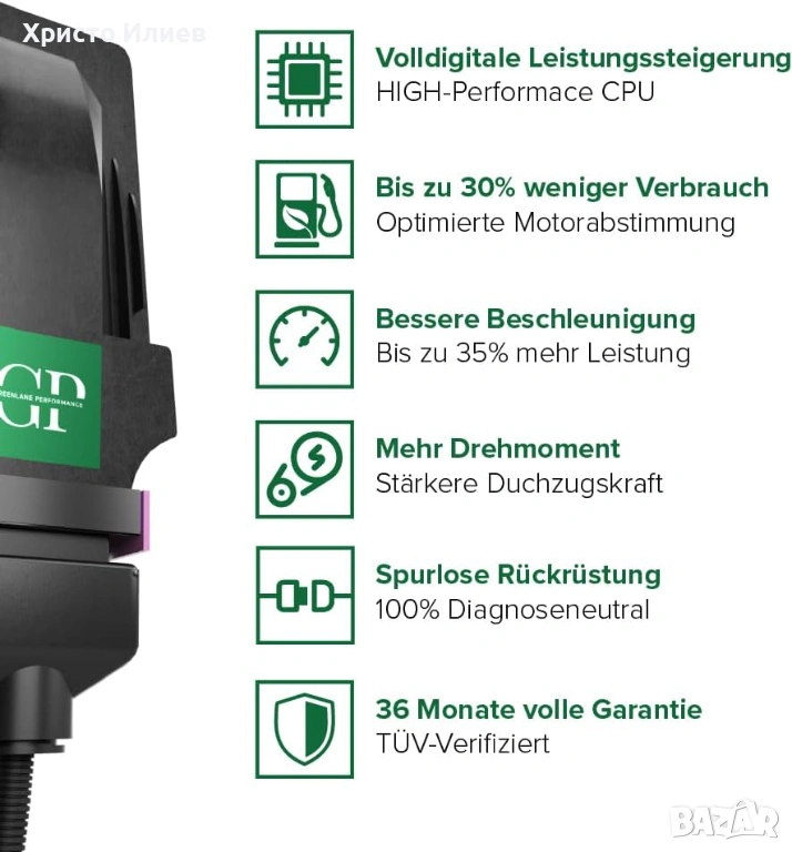 - Съдържание на кутията: GreenLane Performance – специфичен комплект кабели – илюстрирани инструкции за монтаж (английски език не е гарантиран)