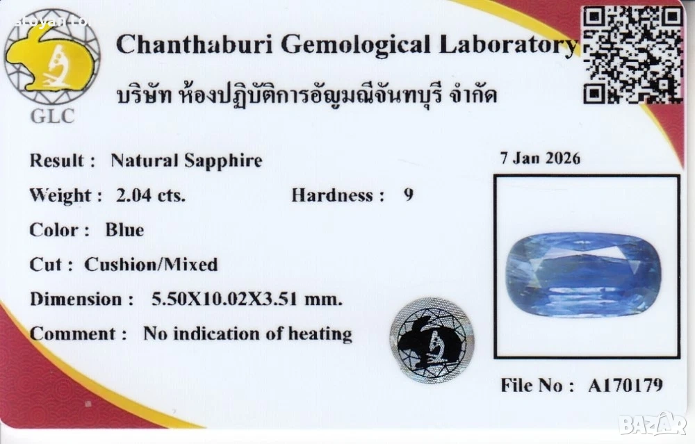Този 2.04кт сапфир от класическия Ceylon (Sri Lanka) произход притежава красив чист син цвят, който свети ярко на светлина и има класическиа шлифовка. GLC сертификатът потвърждава автентичността и липсата на третиране – нещо, което прави камъка много по-ценен от нагрятите (над 90% от сапфирите са heat-treated). Въпреки SI1 включенията и мини чипчето (което е почти незабележимо), той има отличен огън и наситеност.