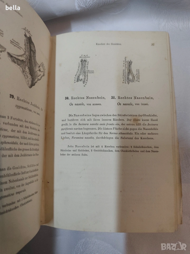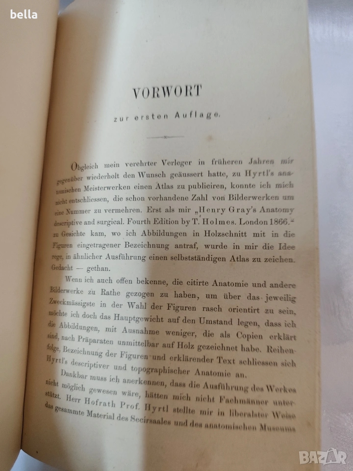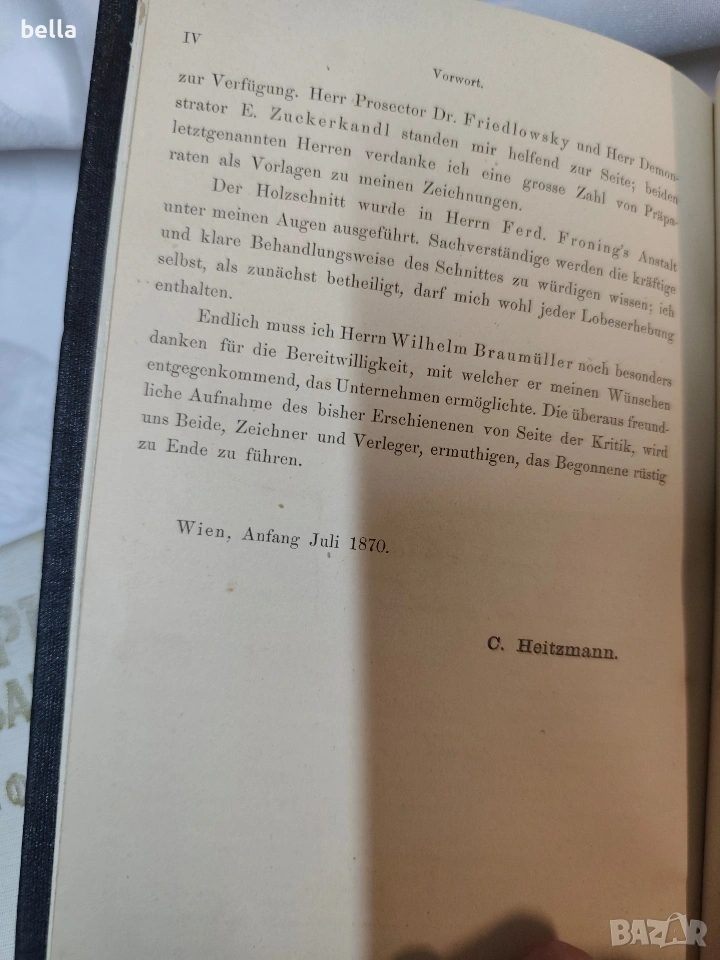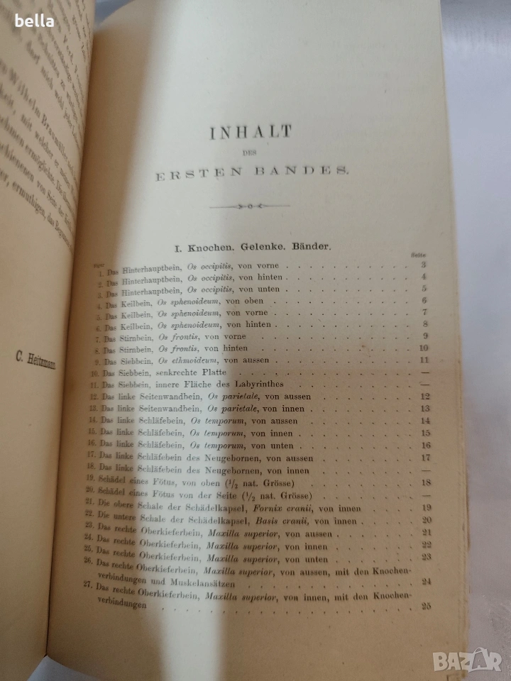Антикварен медицински атлас по Анатомия (1875 г.) – Dr. Heitzmann Продавам ценно антикварно издание на немски език: „Die descriptive und topographische Anatomie des Menschen“ от д-р Карл Хайцман. Книгата е издадена във Виена през 1875 г. от престижното издателство Wilhelm Braumüller. Том: Първи (Erster Band) – включва кости, стави, връзки, мускули и сетивни органи. Илюстрации: Съдържа 320 изключително детайлни дървореза (гравюри), които са запазени в отлично състояние. Състояние: Твърда подвързия, нормални следи от времето за 150-годишна книга. Автентични печати и подписи на предишен собственик (медицинско лице). Език: Немски (латинска терминология).2 леки заблежки в начлото и към средта в долния крй леко тлото е отделено. Рядък екземпляр, подходящ за колекционери, лекари или за декорация на медицински кабинети.Цена 200 евро