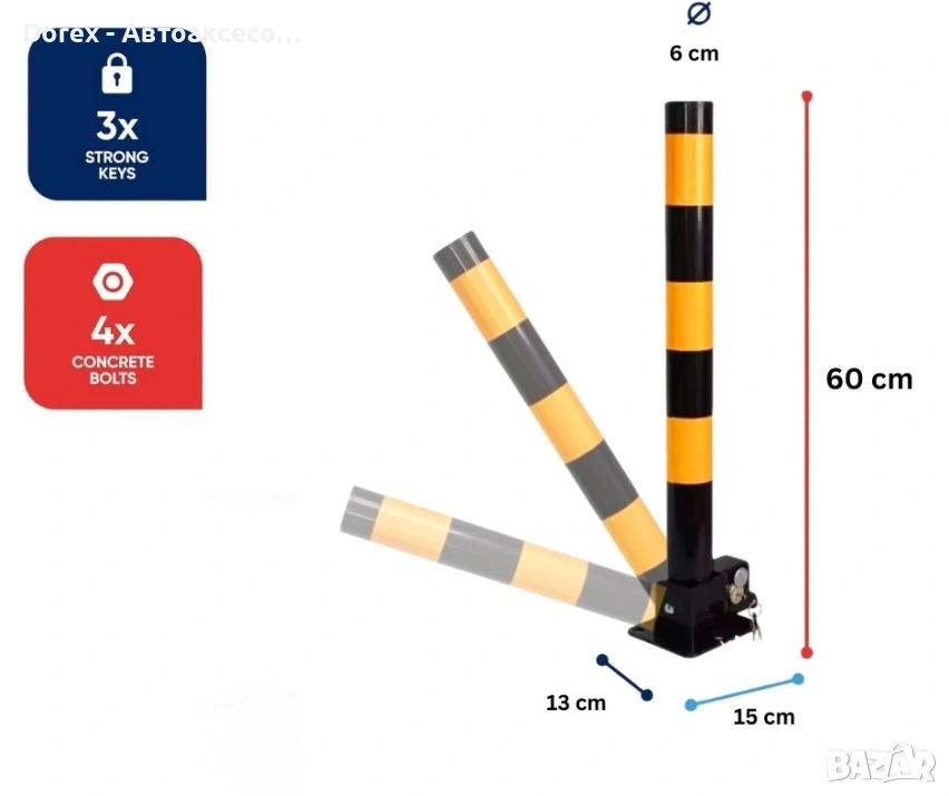 Здрав и надежден сгъваем паркинг стълб, предназначен за защита на частни и служебни паркоместа, гаражи и открити площи. Позволява лесно сгъване, когато не се използва, а вградената ключалка с 3 ключа осигурява надеждно заключване. Черно-жълтите сигнални ивици гарантират висока видимост денем и нощем.