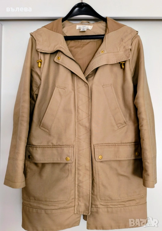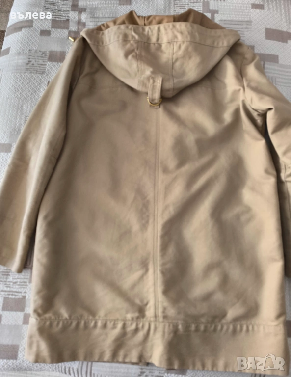 Спортно яке, бежов цвят,прав силует, закопчаване с цип и копчета. С качулка. Памучен плат. Дължина 83см, гръдна обиколка 116см, ханш 116см, дължина на ръкава 59см,рамо до рамо 48см.