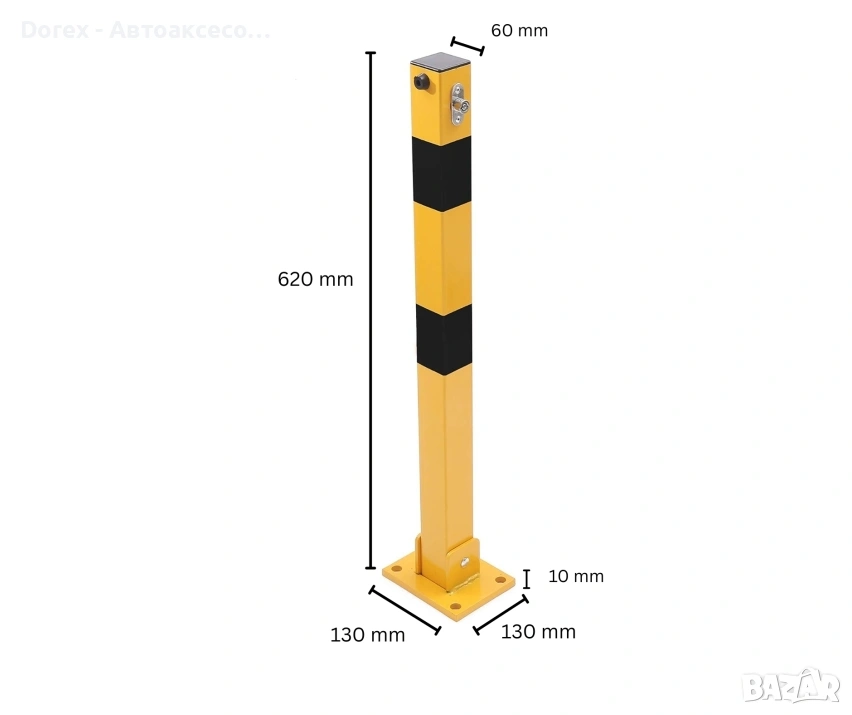 Солиден сгъваем метален стълб за контрол и ограничаване на достъпа до паркоместа, алеи и частни входове. Изработен от бластирана стомана с електростатично боядисване за дълготрайна защита срещу корозия. Може да се прибира напълно до нивото на земята за свободен достъп при необходимост. Вградената заключваща система с 3 ключа и жълтите сигнални ленти осигуряват безопасност и висока видимост през деня и нощта.