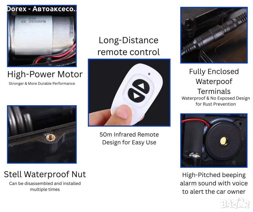 SMART скоба за паркомясто, създадена за сигурна защита на частни и търговски паркоместа. Разполага с мощен DC мотор, дистанционно управление и интелигентна аларма при опит за принудително повдигане или удар. Скобата се захранва с 4 литиево-йонни батерии 3000 mAh, осигуряващи дълга автономна работа, а в комплекта е включено зарядно устройство. Удебелената студено валцувана стомана, антикорозионното покритие и IP67 защита правят устройството подходящо за външен монтаж.