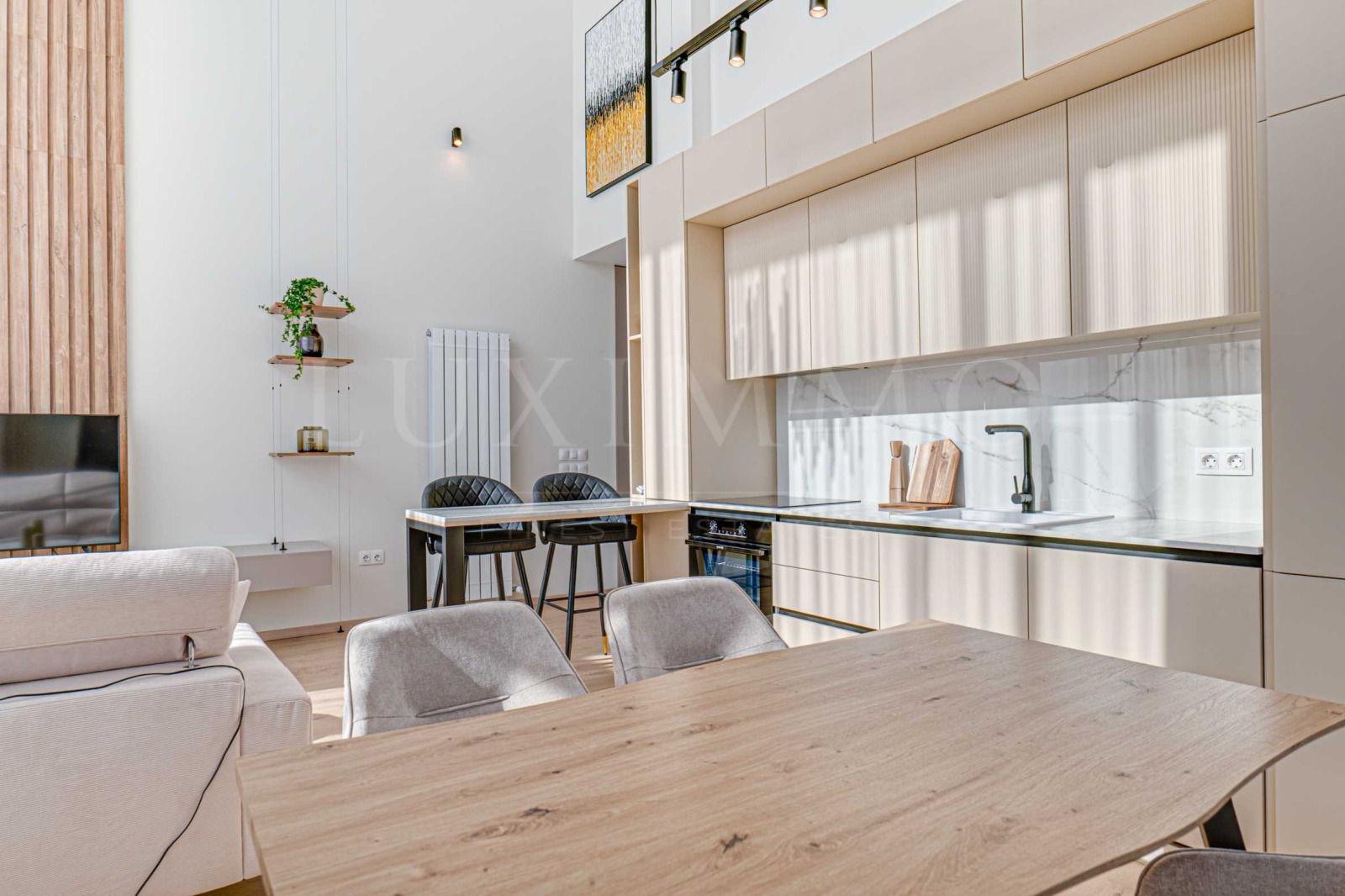 дневна с трапезария и кухненски бокс със светла височина 5 метра.