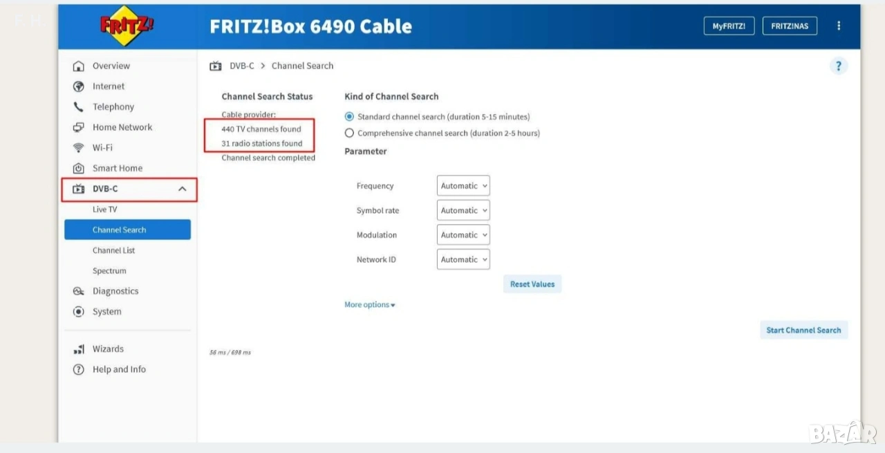 Характеристиките на устройството може да прочетете по-долу. Специфичното в този модел е наличието на DVB-C тунер. Има 4 тунера за кабелна телевизия. Ако ТВ каналите Ви са по коаксиален кабел (не сателитен) с това устройство може да гледате до 4 канала едновременно от телефон, таблет, компютър и т.н в локалната Ви мрежа. AVM FRITZ!Box 6490 Cable wireless router Gigabit Ethernet Dual-band (2.4 GHz / 5 GHz) 4G Red : - Tabletop router Red - Dual-band (2.4 GHz / 5 GHz) Wi-Fi 5 (802.11ac) 1750 Mbit/s - Gigabit Ethernet - USB port - Web-based management Long product name AVM FRITZ!Box 6490 Cable wireless router Gigabit Ethernet Dual-band (2.4 GHz / 5 GHz) 4G Red : Internet over cable with a EuroDOCSIS 1.0/1.1/2.0/3.0 cable modem, 4 x gigabit Ethernet, Wireless AC, 2xUSB 2.0, DECT base station, 2 a/b ports for analog telephones