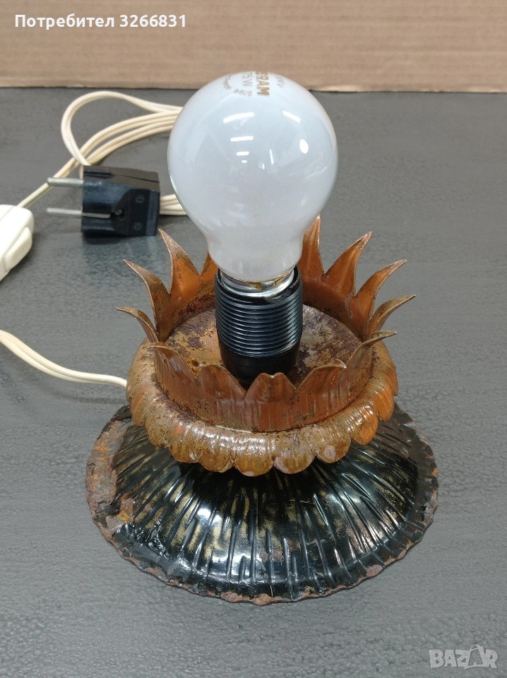 винтидж дизайн от ковано желязо в перфектно състояние, липсва абажур който в долната си част, където влиза в розетката трябва да бъде 75 милиметра в диаметър ,възможен бартер за стари ретро мотоциклети или части за тях с доплащане