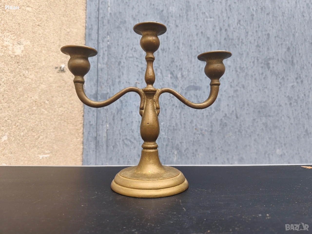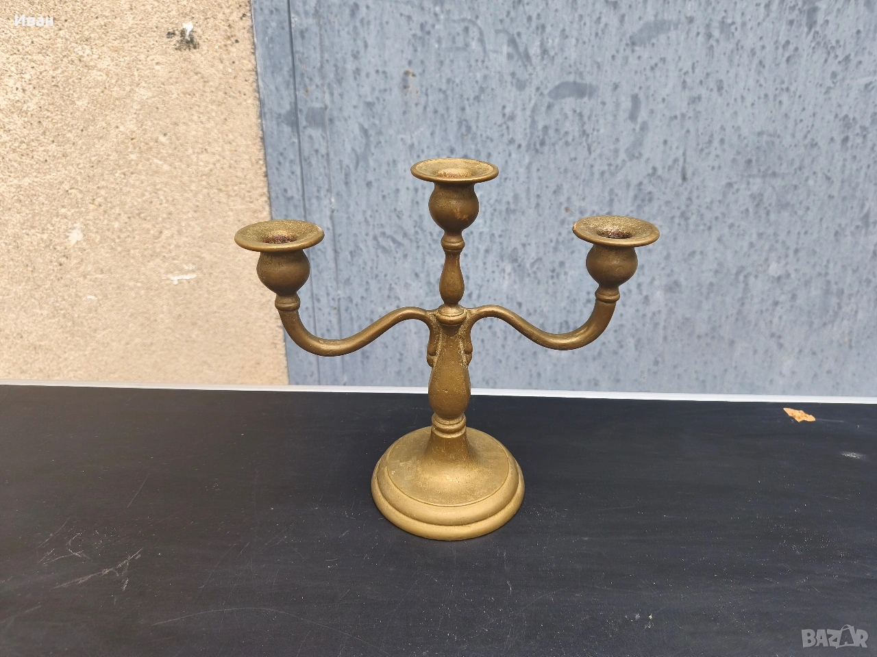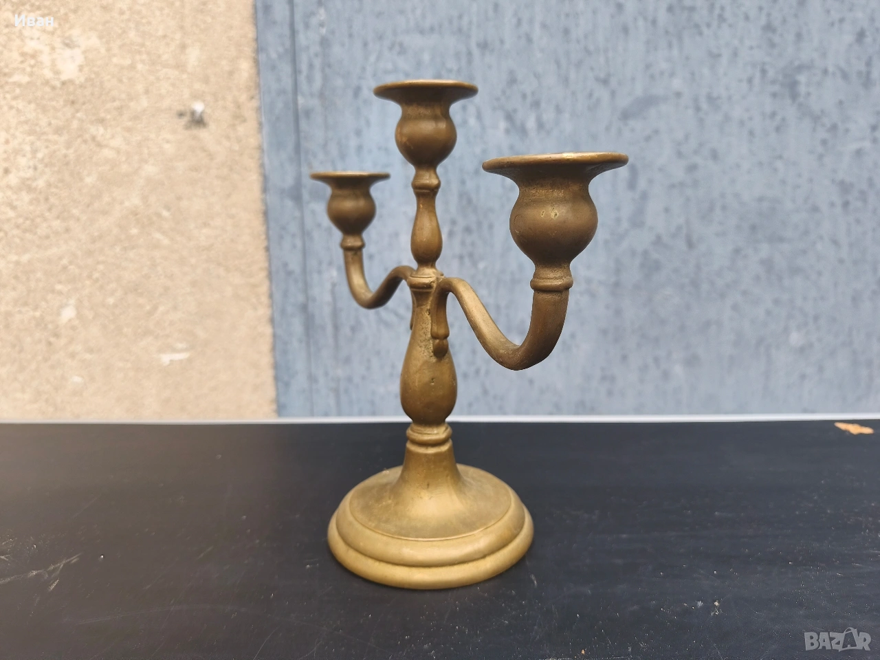 Красив месингов свещник с три свещодържателя. Тегло 1,5 кг Размери видни на снимките