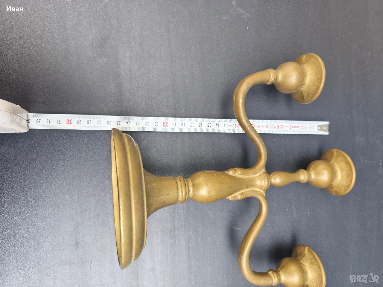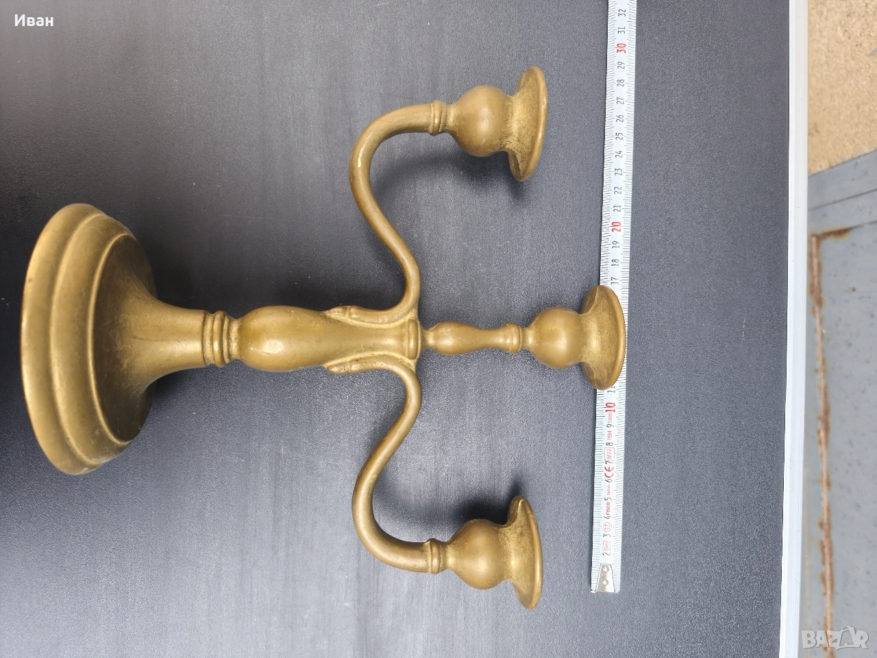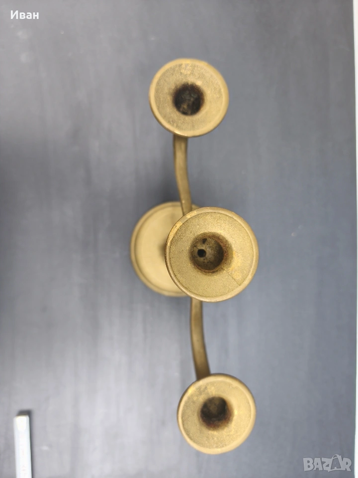 Красив месингов свещник с три свещодържателя. Тегло 1,5 кг Размери видни на снимките