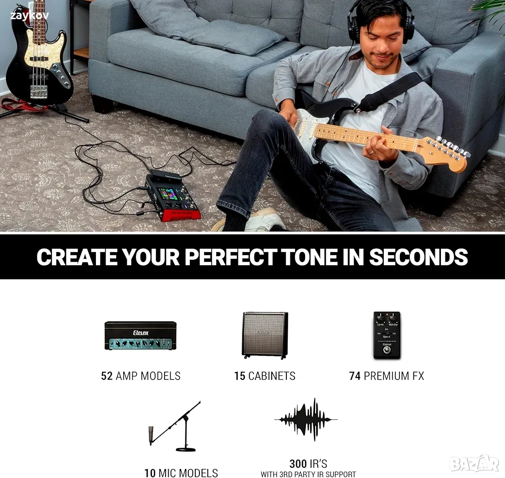 Гъвкава библиотека от реалистични и отзивчиви модели на усилватели, кабинети, микрофони и ефекти, която ще бъде разширявана с редовни актуализации на фърмуера въз основа на обратната връзка от потребителите, плюс USB аудио интерфейс