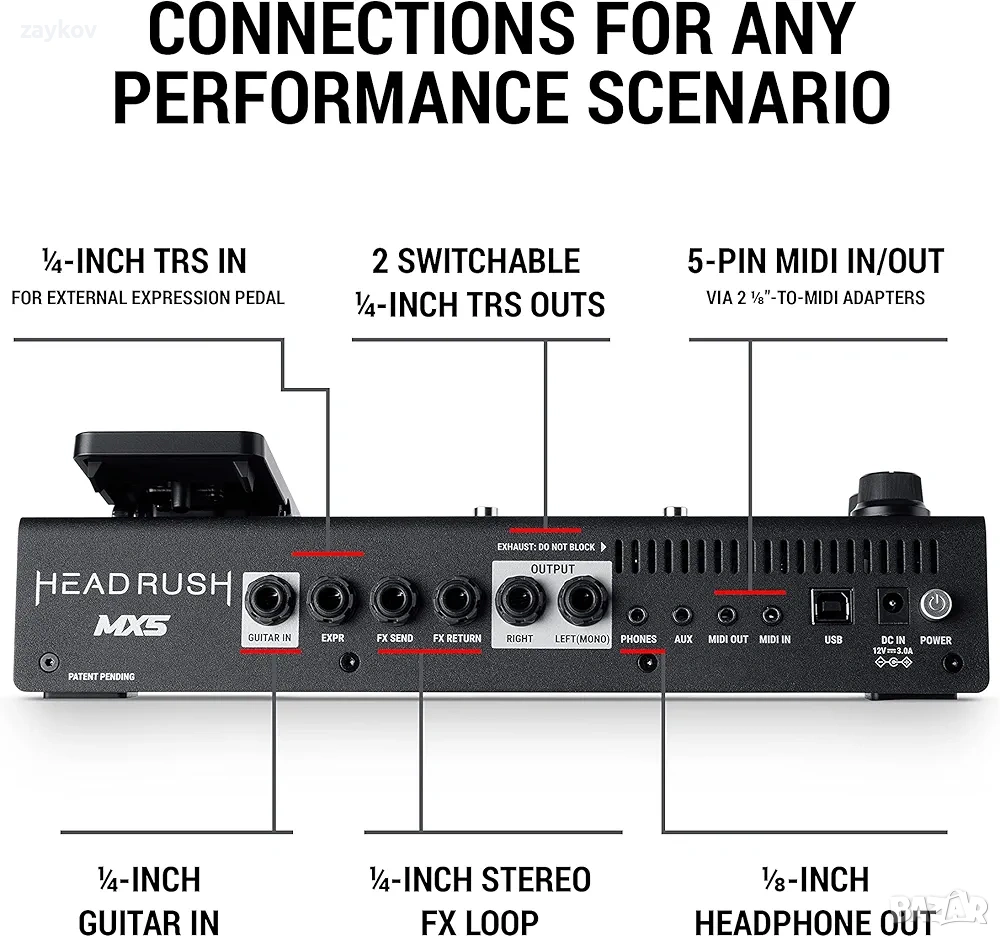 Всички конектори – Разполага с ¼-инчов вход за електрическа и бас китара, превключващи (2) ¼-инчови TRS изхода, 1/8-инчов изход за слушалки, 5-пинов MIDI вход/изход чрез (2) 1/8""-към-MIDI адаптера, плюс вграден ¼-инчов стерео FX контур.