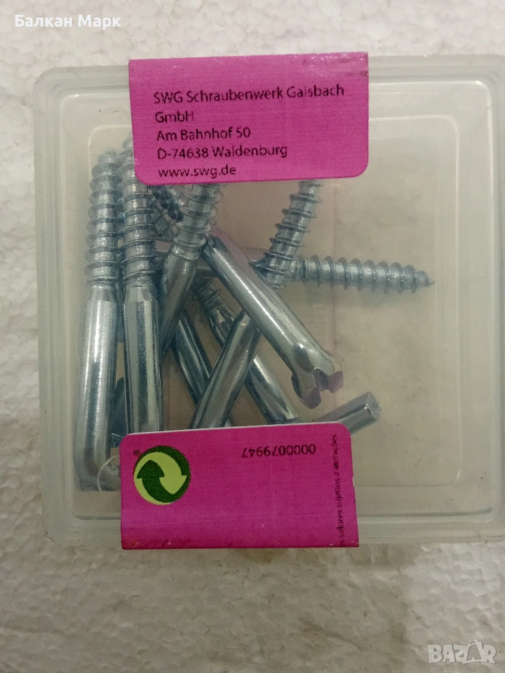 Продавам висококачествени крепежни елементи, внос от Германия (част от разнообразна палетирана стока). Идеални за здрав монтаж в дърво или дюбел.