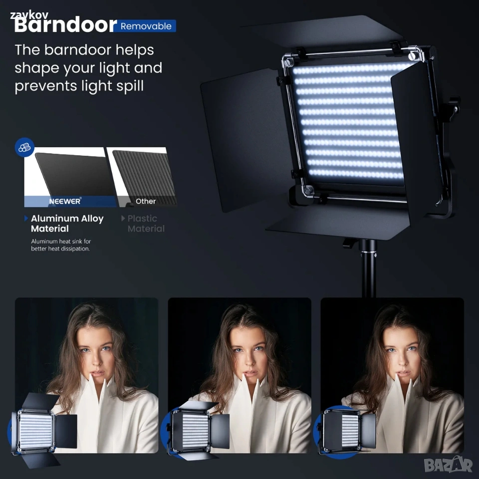 Двуцветна LED видео лампа - NEEWER NL660 разполага с 330 топлобели и 330 студенобели светодиода, които излъчват до 3300lx/1m, предлагайки достатъчна яркост за професионална студийна фотография. 3200K-5600K позволява плавно превключване от 3200K волфрамова светлина към 5600K дневна светлина, заедно с диапазон на затъмняване от 0-100% и CRI96+ за реалистично възпроизвеждане на цветовете. Идеално оборудване за ключово/меко запълващо осветление за видео подкасти, студийни фотосесии, интервюта, продуктови снимки с камера, портрети, стрийминг на живо, бръснарство и др.