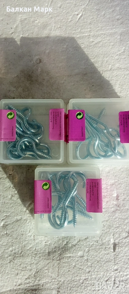 Продавам здрави и надеждни винтови куки с поцинковано покритие, идеални за окачване на предмети, ремонтни дейности и монтаж. Продуктът е част от палетирана стока, директен внос от Германия.