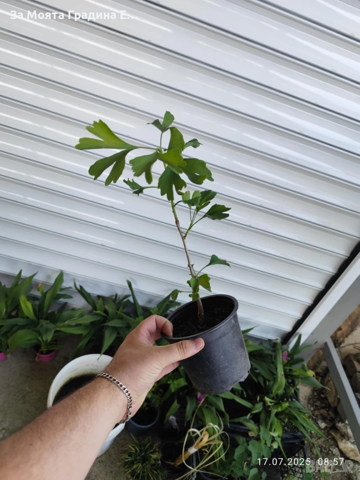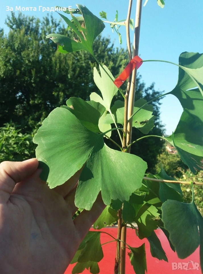 Гинко билоба Размер около 25-35см за 5€ За поръчка пишете на лично. Изпращаме чрез еконт. Растенията ни са в саксии и това позволява да се засаждат цяла година или могат да се гледат така с месеци Гинко билоба (Ginkgo biloba) е уникално дърво, което няма живи родственици. То е класифицирано в свой обособен отдел Ginkgophyta, съдържащ единствен клас Ginkgoopsida, разред Ginkgoales, семейство Ginkgoaceae, род Ginkgo, и е едиственият съществуващ и днес вид в този отдел. Гинко билоба е един от най-добре известните примери за „живо изкопаемо“. Растенията са в контейнери, което позволява засаждането им да се извършва почти целогодишно. Много от растенията променят вида си през периодите на своята вегетация, но тук в сайта със снимки се представят в най-атрактивния им вид. Повечето снимки в сайта ни покзват как ще изглеждат растенията след определен период и положени необходимите грижи.
