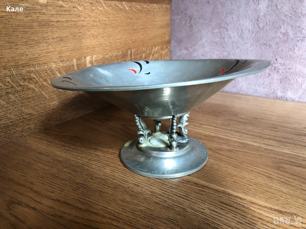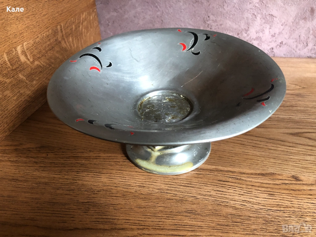 от употреба. Използвана е за свещници. Леко е изкривена. Маркировка на дъното.