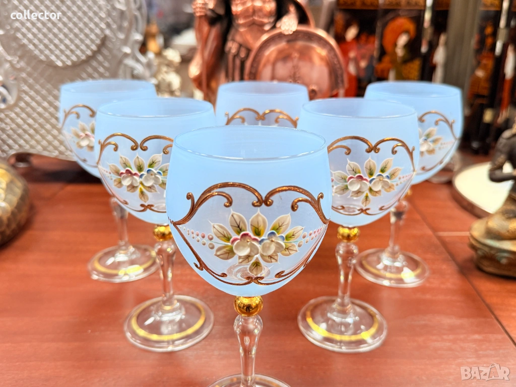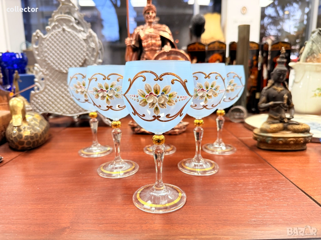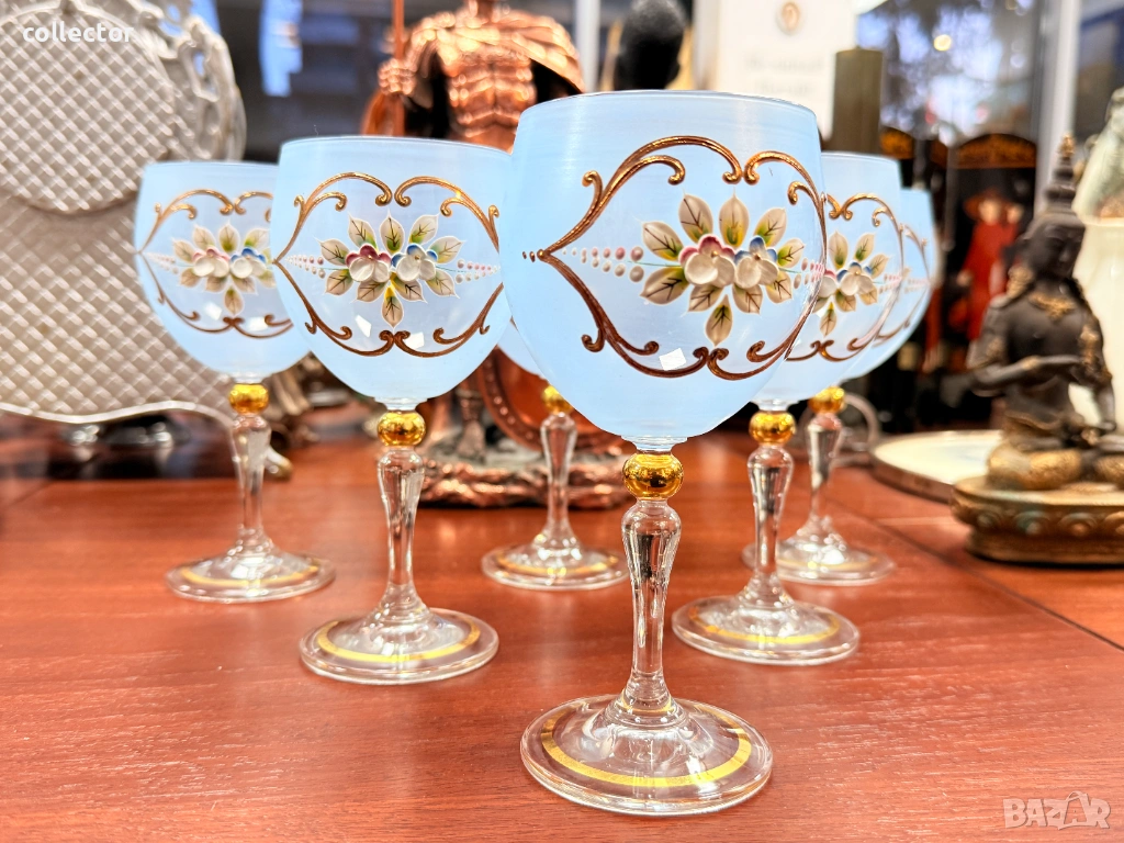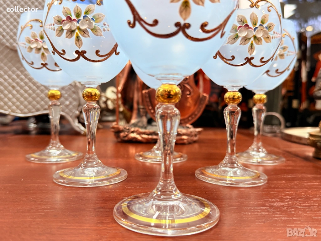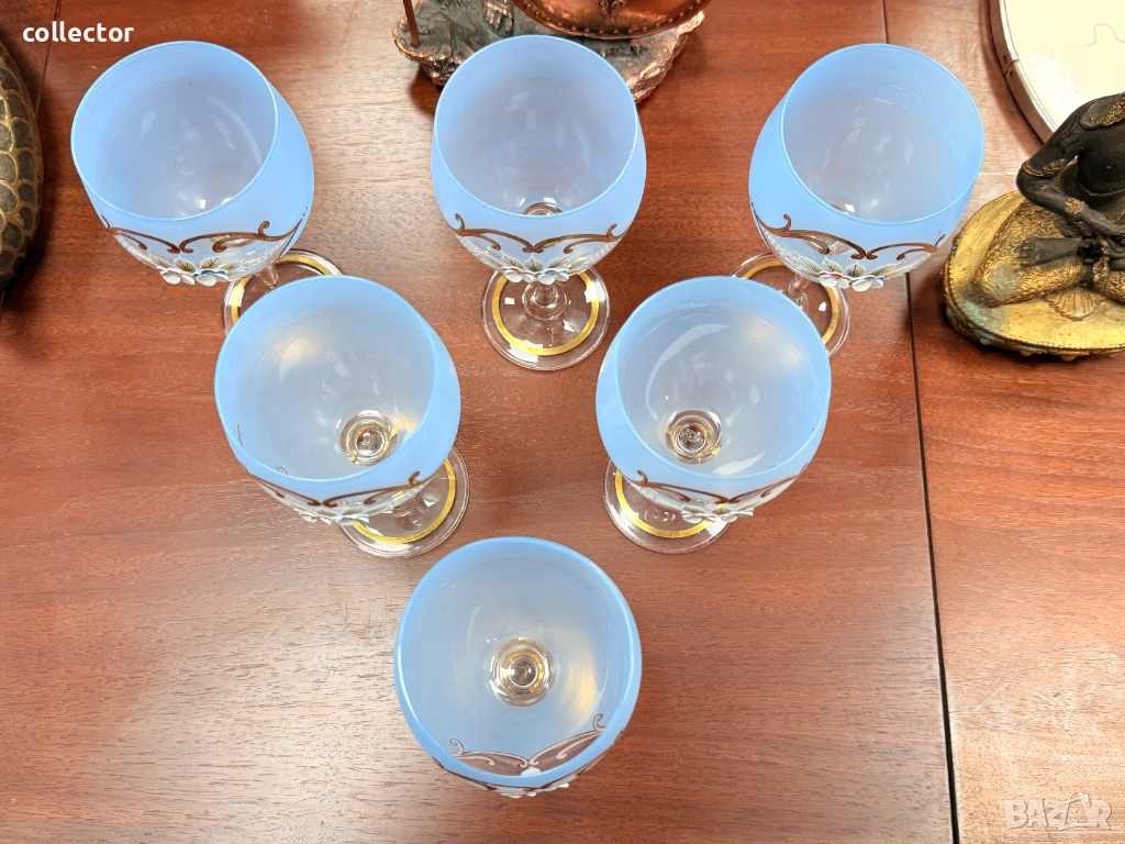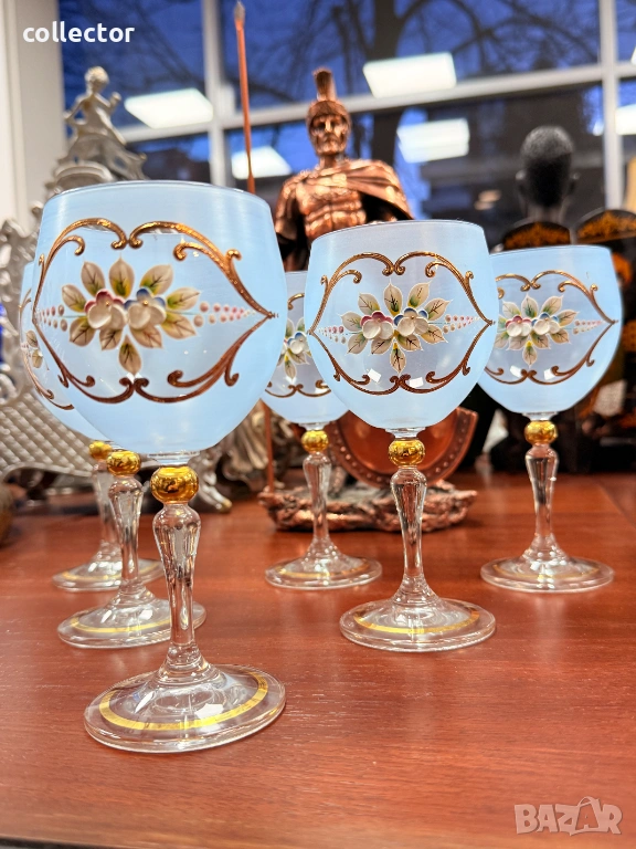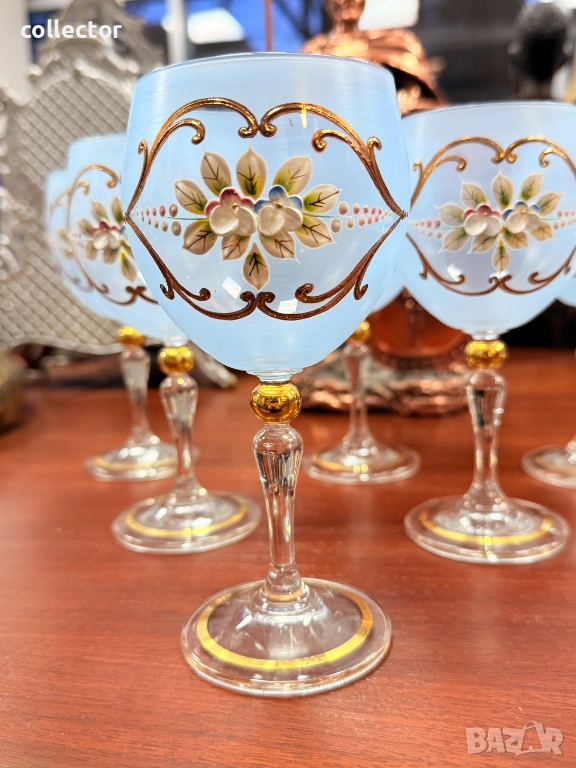 Чашите са направени от светлосин опалов кристал. Декорацията е изключително детайлна, включваща ръчно рисуван релефен емайл (бели и цветни цветчета) и орнаменти от 24-каратово злато. ⭐ ПРЕКРАСНИ 🍀