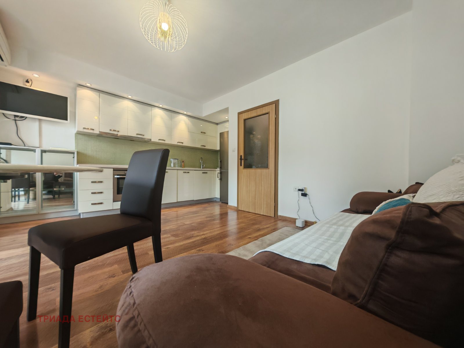 Кухня: Оборудвана с фурна, котлони, абсорбатор, съдомиялна машина и хладилник.