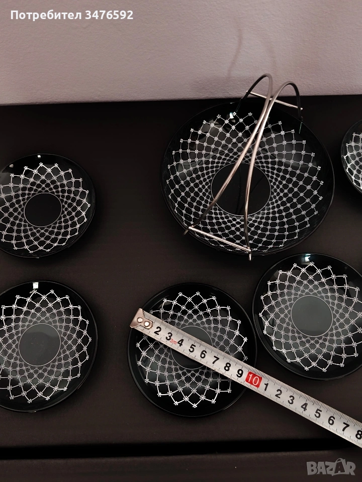 Продавам руски сервиз за десерт, тъмнозелено стъкло с бяла украса. Размерите са снимани. Щипката от голямата чиния може да се маха. Комплектът е нов, закупуване е от Русия през 80-те години. Опаковам сигурно за моя сметка и изпращам с куриер Еконт.