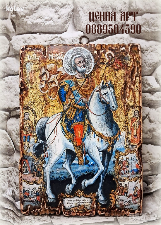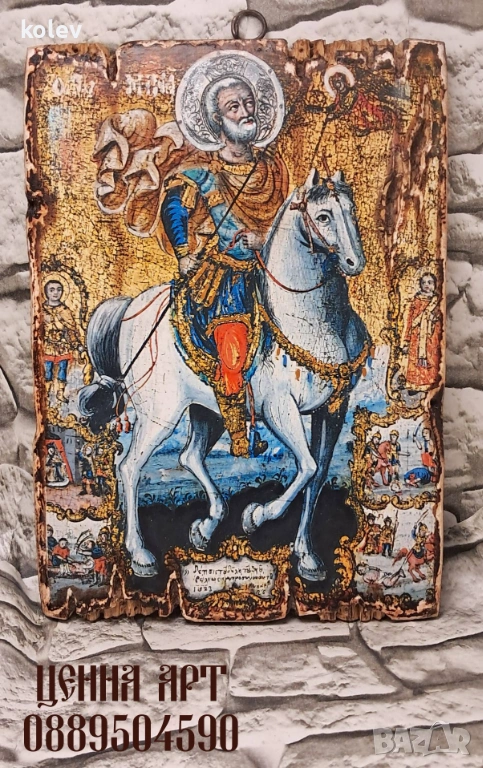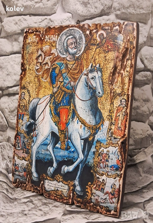 Икона Свети Мина на кон със светци 25/18 см - УНИКАТ, декупаж