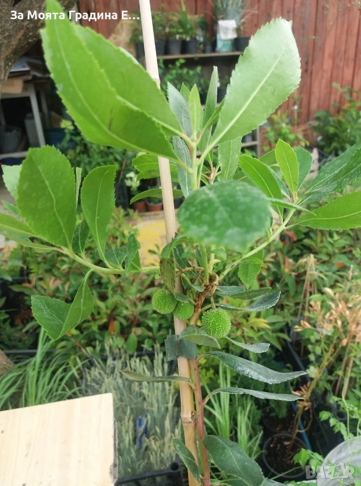 Ягодово дърво – Арбутус Размер около 5-10см за 6,50 € Размер около 15см за 9,50 € Размер 25-35см за растения на 2г 17,50 € Размер около 50-60см за растения на около 3г 22 € Размер около 90-110см за 32€ Растения на 4-5г в плододаваща възраст Студоустойчив ! Ядлив екзотичен вечнозелен храст, който с годините придобива формата на дърво. Достига височина 4-6м.Цъфти и плододава от Октомври до Март. Когато е напълно узряло, смътно напомня на пъпеши или кайсии. В Странджа планина можете да го срещнете като един от редките вечнозелени видове, които придават неповторимото очарование на природата там, която дори в най-суровото време изглежда свежа и зелена. Атракция представляват плодовете на Арбутуса, които са с големина около 2-3см и приличат на ягодки от където идва и народното наименование на растението Ягодово дърво. Засаждайте растенията на светли, полусенчести изложения, защитени от вятър. Предпочита компанията на Дафинов лист, Дъб, Юниперус Студоустойчив ! Растенията са в в контейнери, което позволява засаждането им да се извършва почти целогодишно. Много от растенията променят вида си през периодите на своята вегетация, но тук в сайта със снимки се представят в най-атрактивния им вид. Повечето снимки в сайта ни покзват как ще изглеждат растенията след определен период и положени необходимите грижи.
