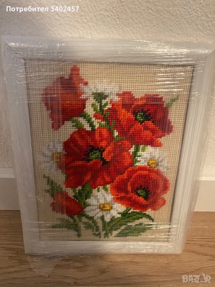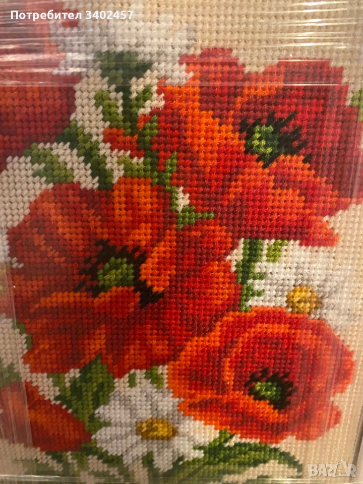 Красив гоблен с ярки червени макове и бели цветя. Размер 22 x 27 см, с големи бродерийни бодове. Подходящ за декорация на дома или подарък. В рамка.