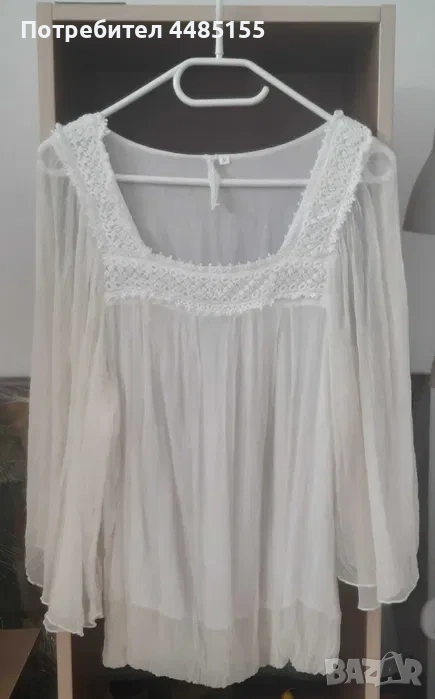 Великолепна блуза LAKLOOK M, 100% коприна. Моделът е официален, разкошен, с трапецовидно изрязано деколте и бродерия около него. Ръкавът е широк. Блузата е нова, необличана, изпрана на ръка с фин препарат.