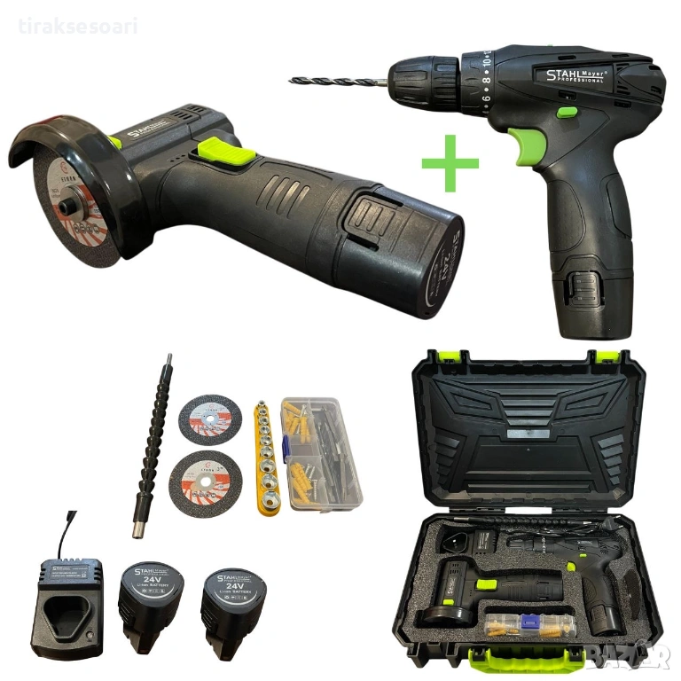 акомулаторен винтоверт 24v, мини ъглошлайф 24v, stahlmayer комплект, винтоверт с батерия, безчетков ъглошлайф, комплект инструменти 24v, ударен винтоверт 55nm, професионален комплект инструменти