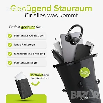 Задължителна вещ с много място – вашата велосипедна чанта VELMIA 3-в-1 с 26 литра място за съхранение, подвижно отделение за лаптоп и много други, е задължителна за всеки колоездач, гърбът ви ще остане свободен от пот и натоварване.