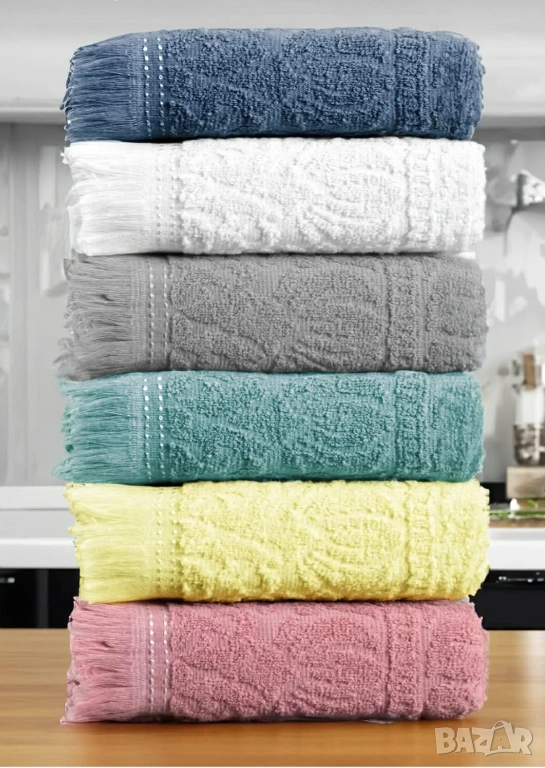 Нови памучни хавлиени кърпи, 100% памук. Размерът е 35х50 см. с реснички по края. Комплектът включва 6 кърпи в различни цветове, които са меки и абсорбиращи. Идеални за кухня, за ръце, за лице, за баня.