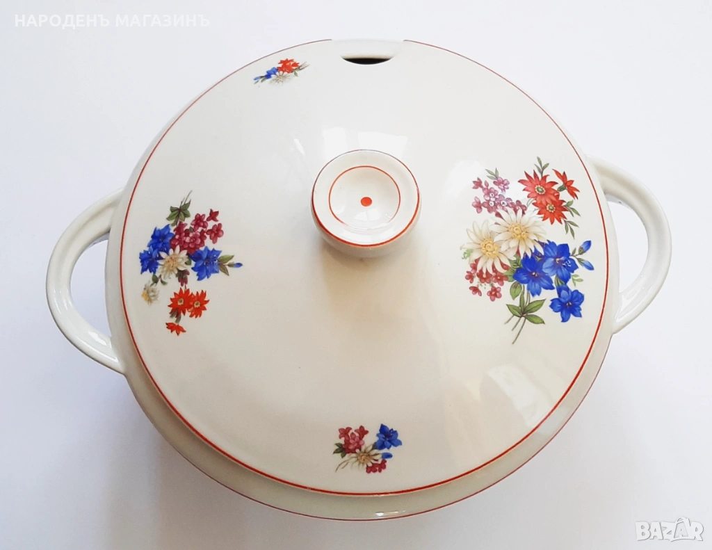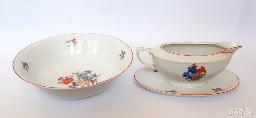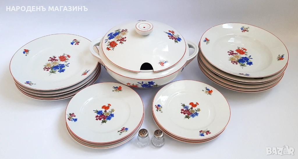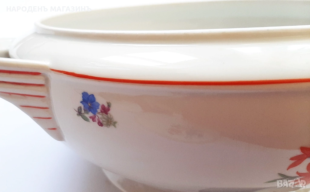 и микро неравности, тук там прекъсване с по 1 милиметър на червения кант. През годините от съхранението 6-тата чиния за основно има косъм, не пречи на употребата, тя също е подарък и не е включена в цената, сосиерата и купата са подарък , имат по един чип, в основата на купата има фабрична микро неравност