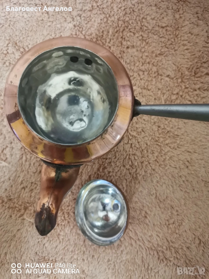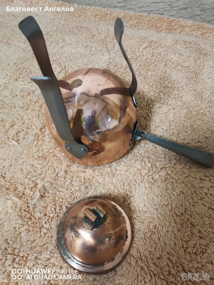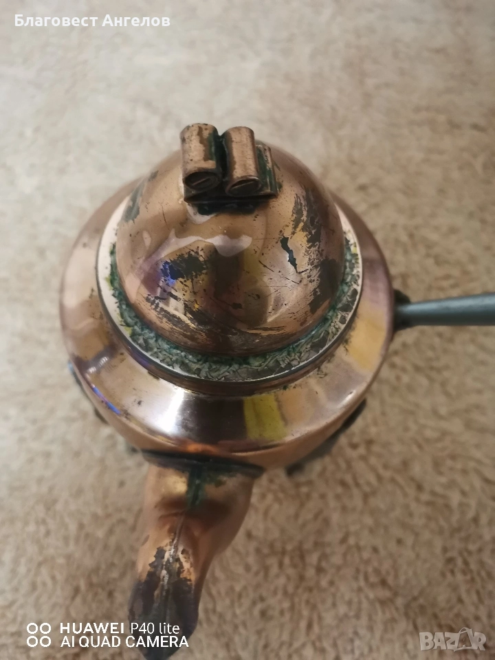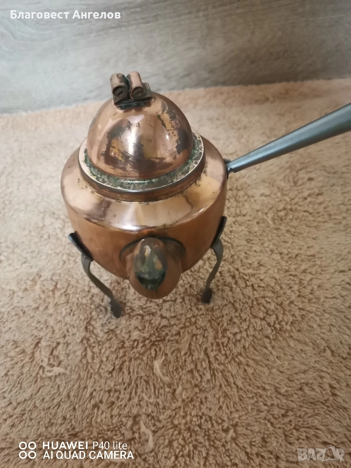 Меден чайник за декорация, не става за ползване, височина 17см, вместимост 300 мл. Крачетата и дръжката не са медни.