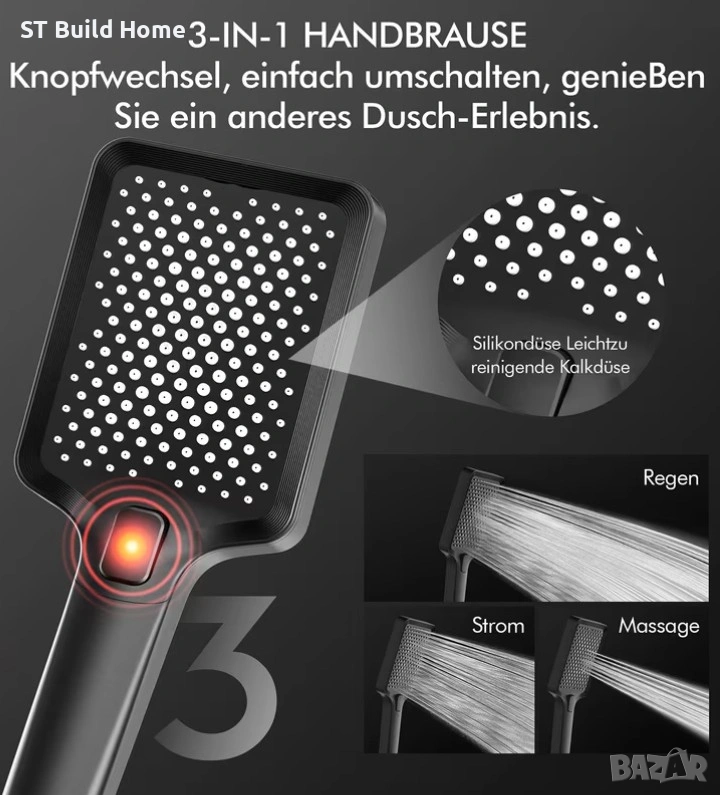 🚿 Ръчен душ с 3 режима – стандартна струя, масаж и дъждовен ефект