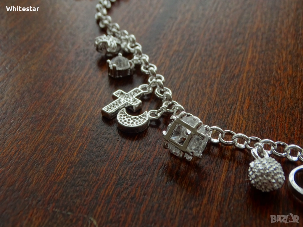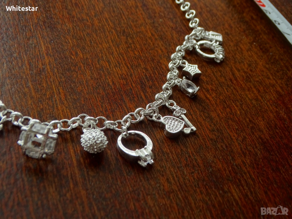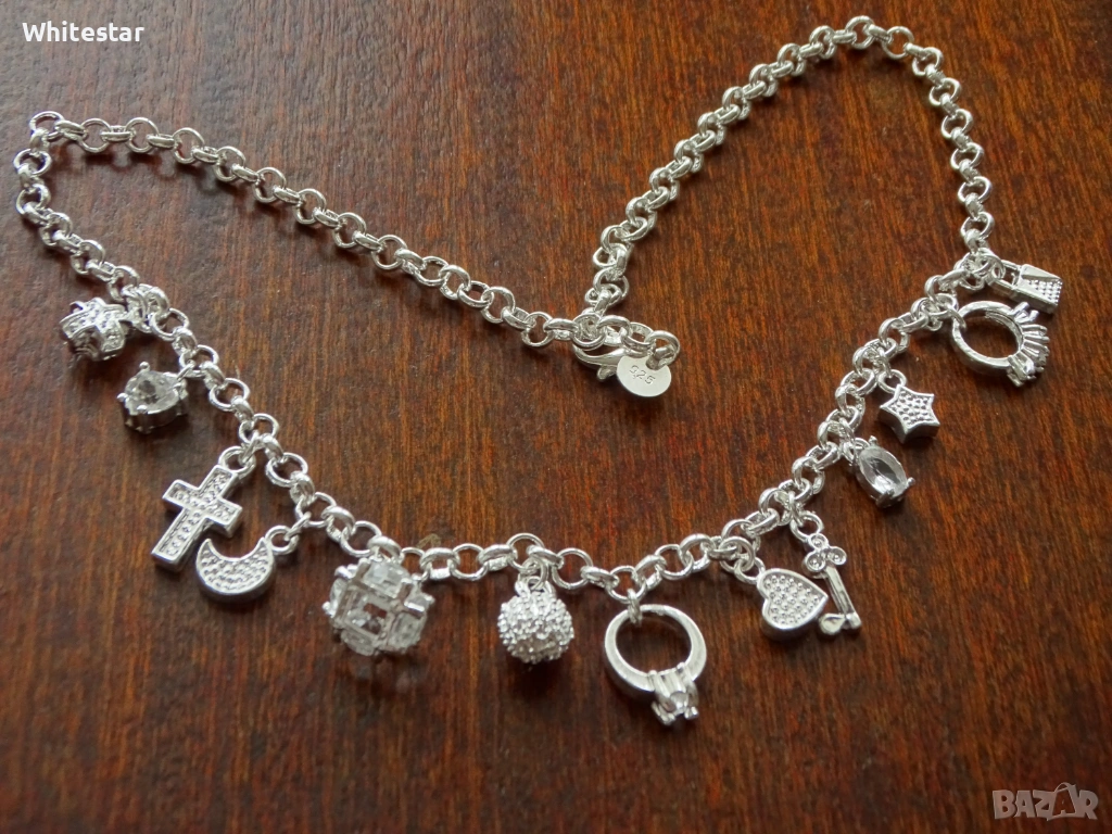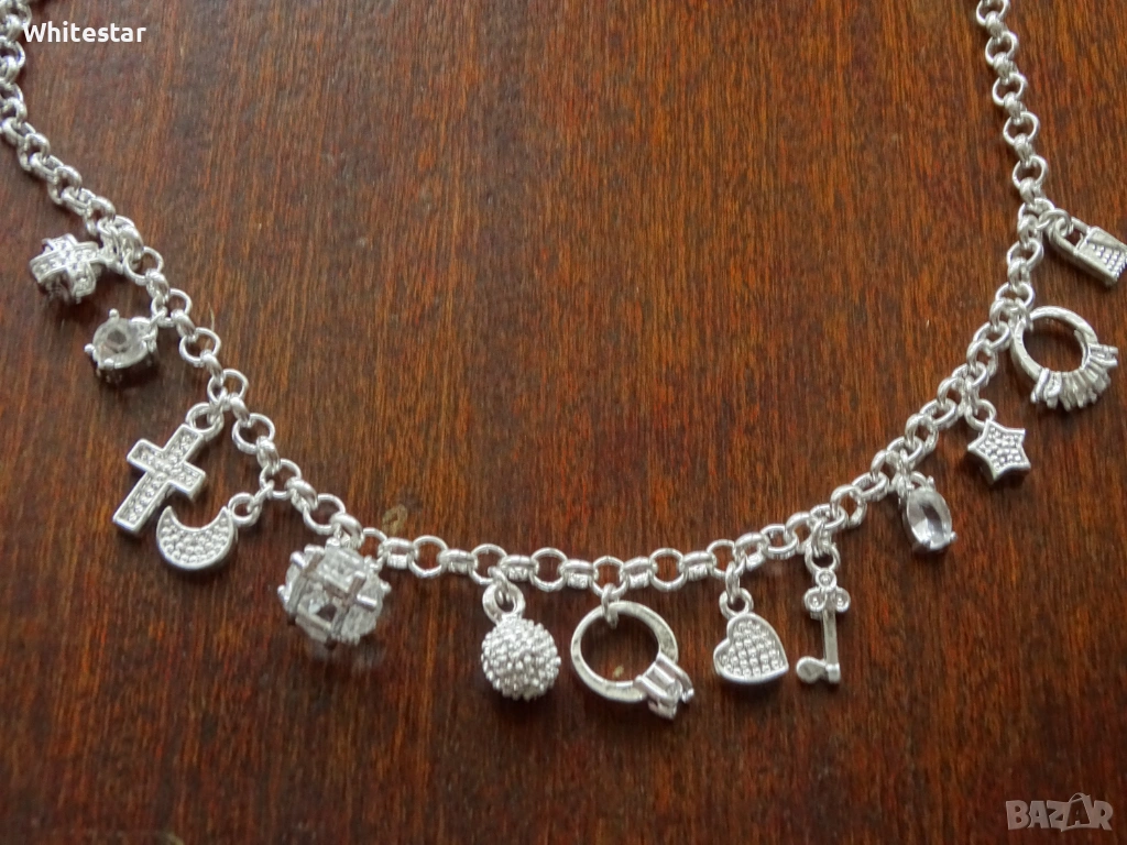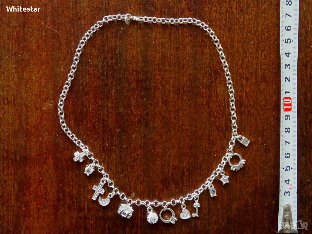 Красиво, посребрено дамско колие с висулки. Чудесен и оригинален мотив с разнообразни висулки. Качесвено сребърно покритие - идентично с оригинален сребърен накит. Атрактивна цена. Даставка с Еконт/Спиди в цялата страна, при условията на наложен платеж.