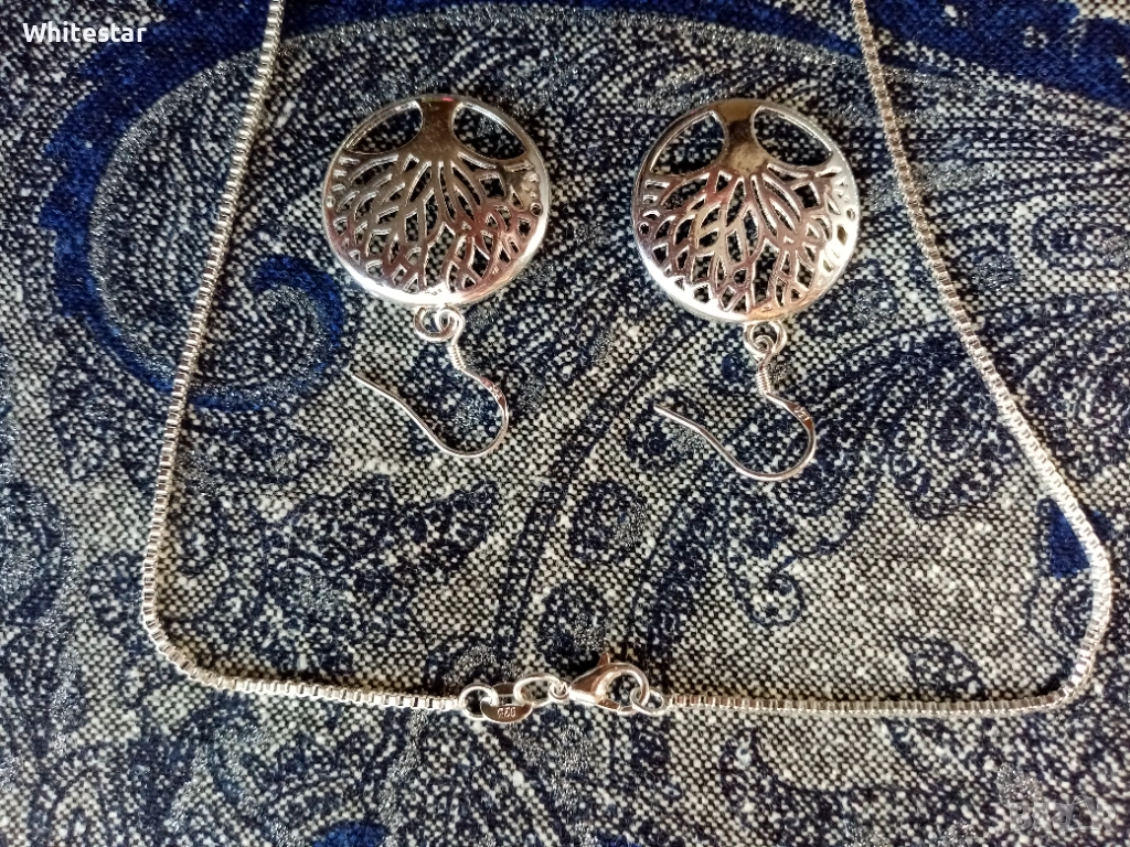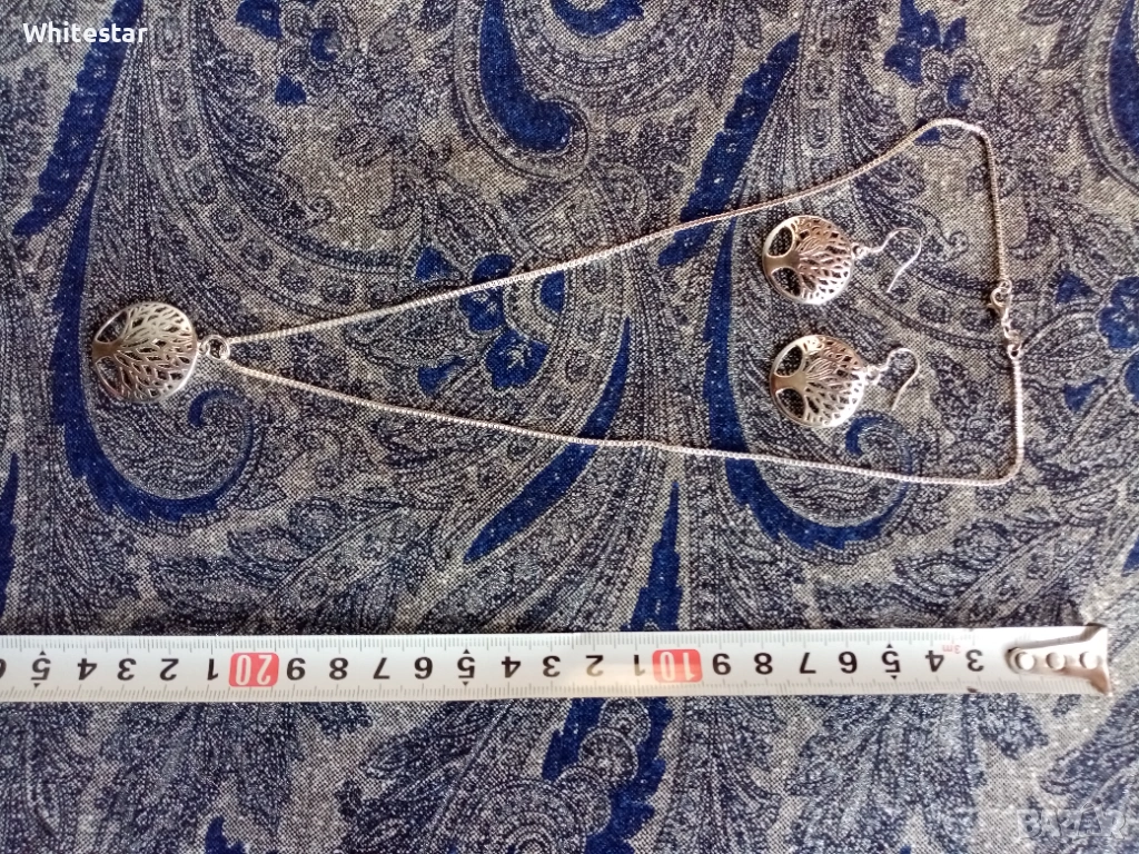 Много красив, посребрен, дамски комплект, състоящ се от колие, гривна и обеци, с мотив "Келтско дърво". Качествено сребърно покритие, чисто нов накит, изваден от пликчето само за снимката, идентичен с оригинален сребърен комплект, атрактивна цена. При интерес - доставка с Еконт/Спиди, при условията на наложен платеж.