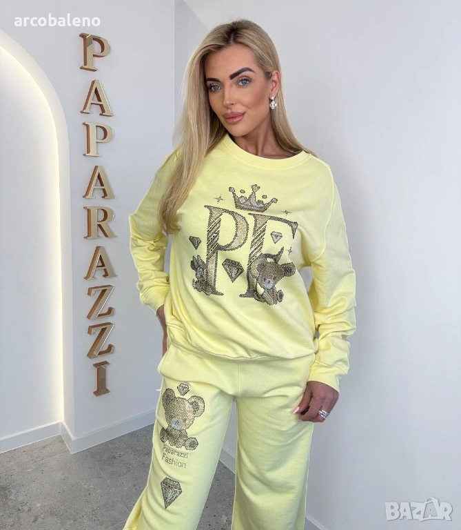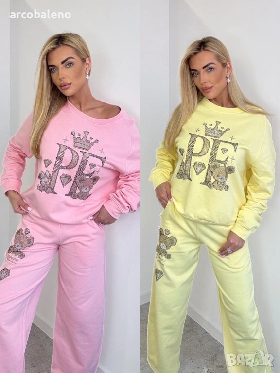 Този впечатляващ дамски комплект, изработен от висококачествен памук, е перфектният избор за модерен и удобен стил. Той включва удобен суитшърт с дълъг ръкав, украсен с луксозна апликация от кристали с мотива PF и очарователен декоративен акцент, както и вталени панталони, които позволяват свобода на движение и перфектно прилягане.