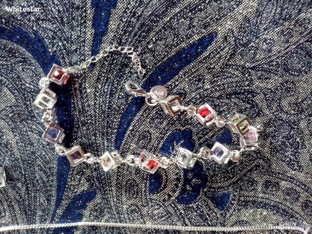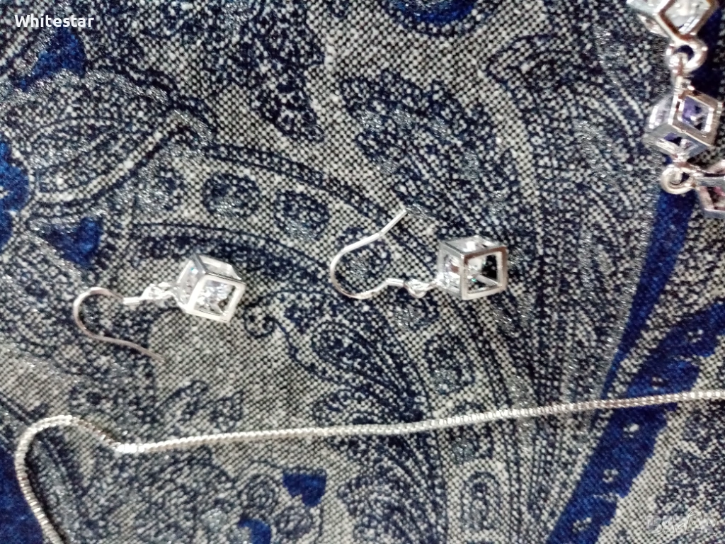 Посребрен дамски комплект - ланец, гривна, обеци - "Кубче с кристал" → Обява 53623575