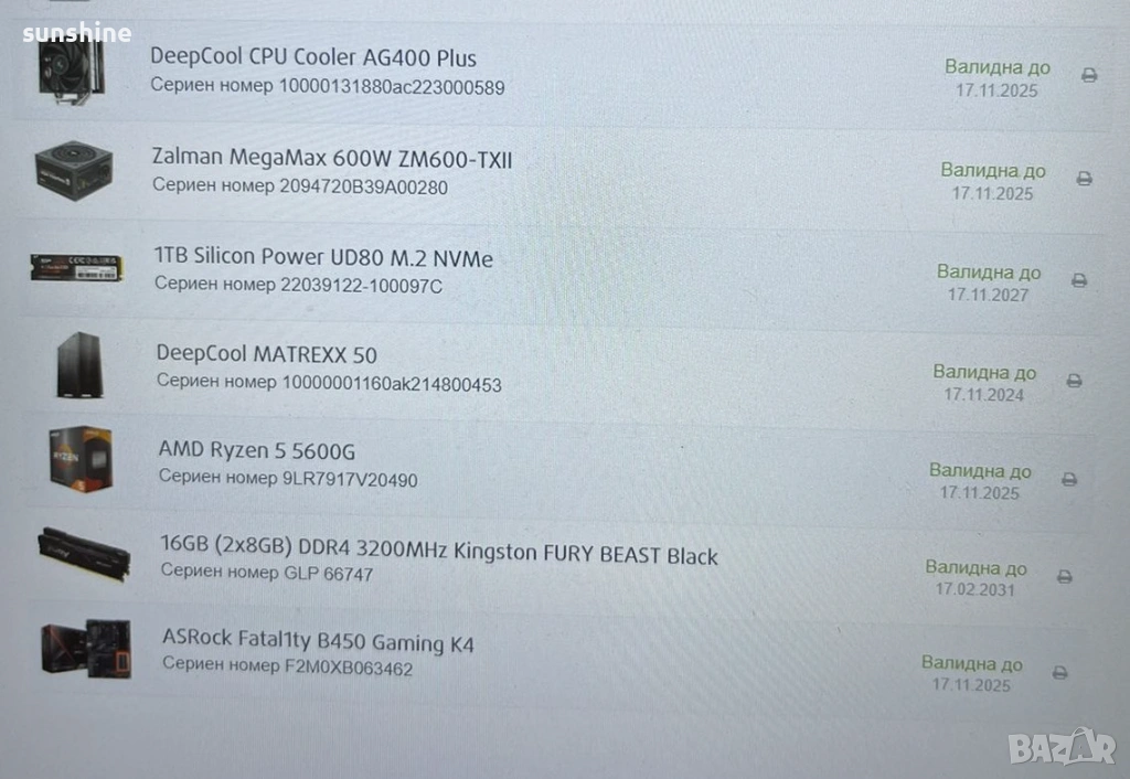 Компютърът на практика е съвсем малко използван (общо няколко месеца). Купих го преди време (лятото на 2024) да го ползвам в друга локация, но така и не се случи - само го тествах и така си седи. Предния собственик сам си го е сглобил като всички части са поръчани чисто нови наведнъж, с изключение на видео картата, която е ползвал малко преди това, Вижте приложената снимка - там се вижда и до кога е гаранцията на всеки елемент.