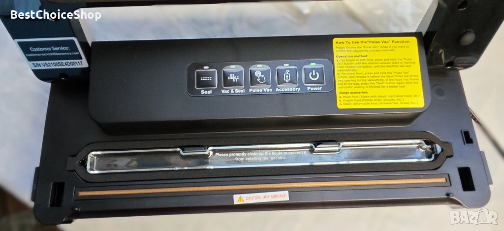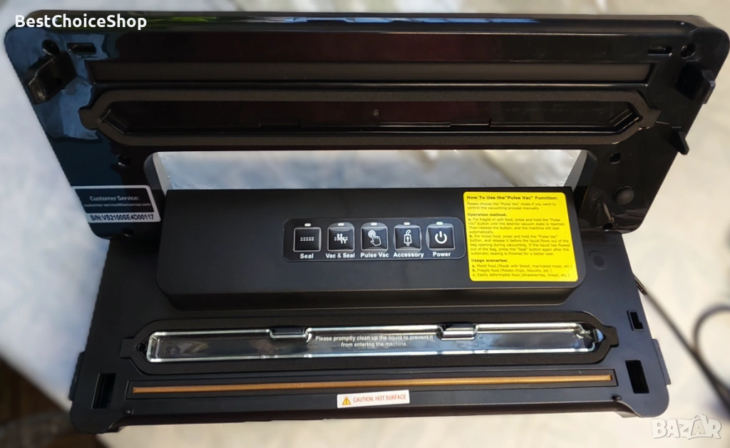 - Режим „Pulse Vac“: За влажна храна задръжте „Pulse Vac“ и отпуснете бутона, след като течността достигне горната част на торбичката. След като машината завърши автоматичното запечатване, натиснете отново бутона „Seal“ за по-добро запечатване.