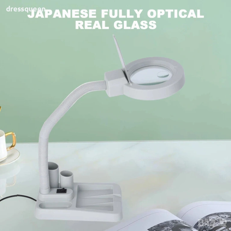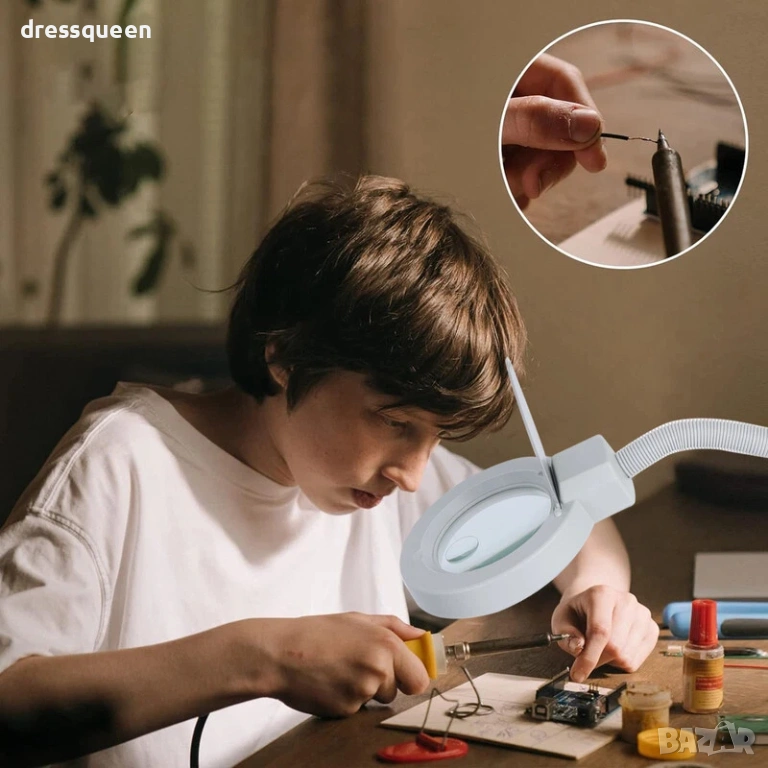 Пълен комплект: Получавате всичко необходимо за старт – здрава основа, лампа с лупа и захранващ адаптер.