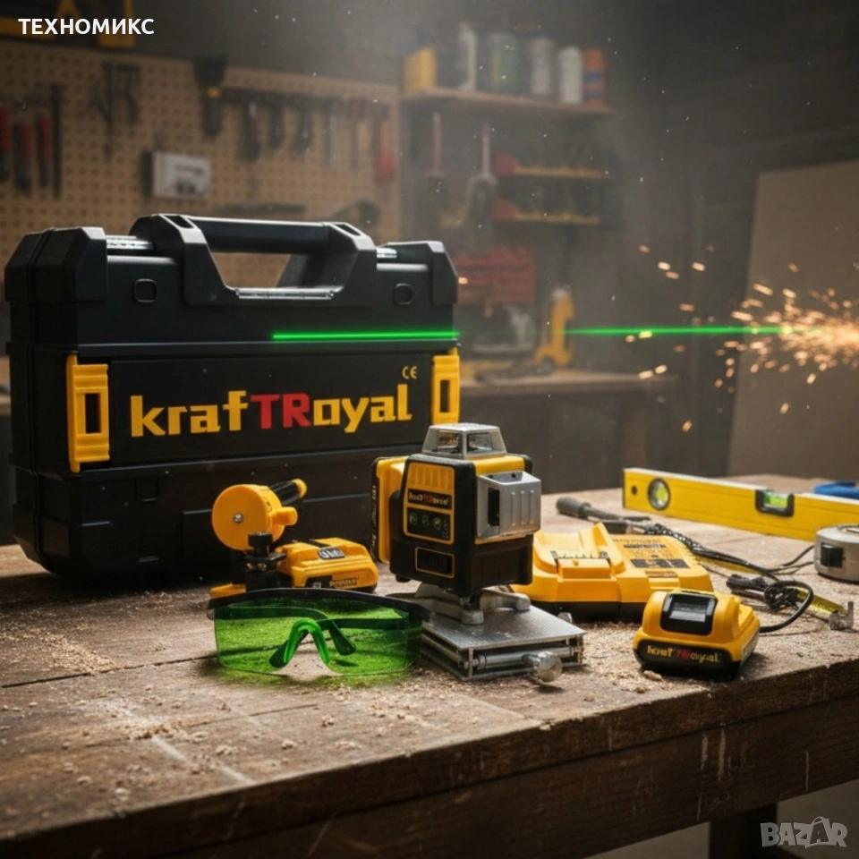 Лазерен нивелир Kraft Royal, самонивелиращ, 4D, дистнационно, жълт, 5V
