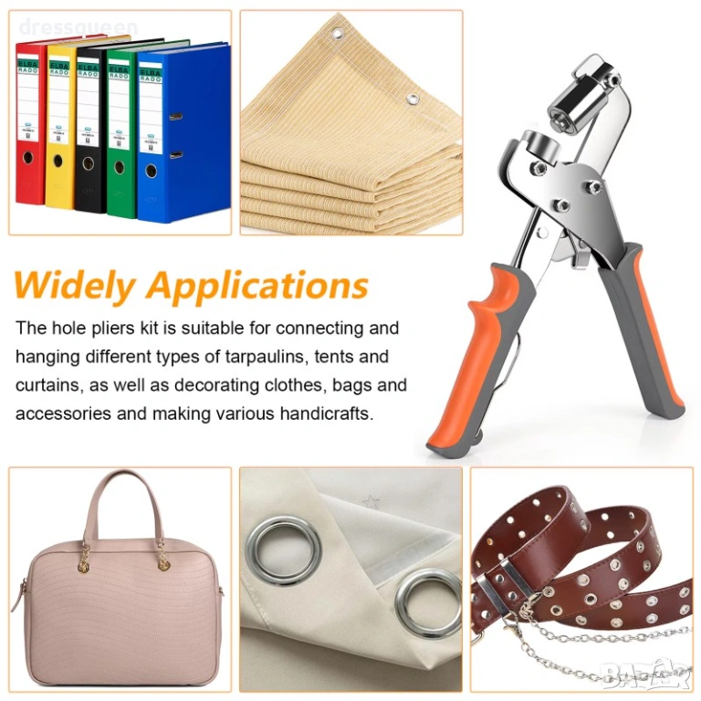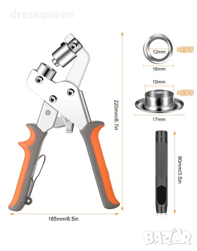 Комплектът съдържа всичко необходимо за работа: 1 брой клещи, 1 брой замба, подложка за пробиване и 200 метални халки.