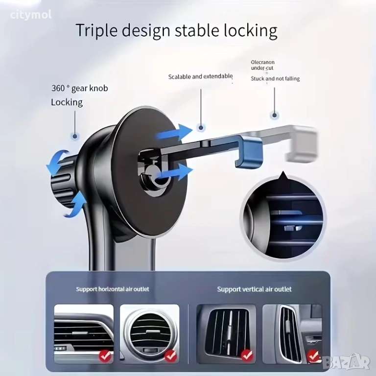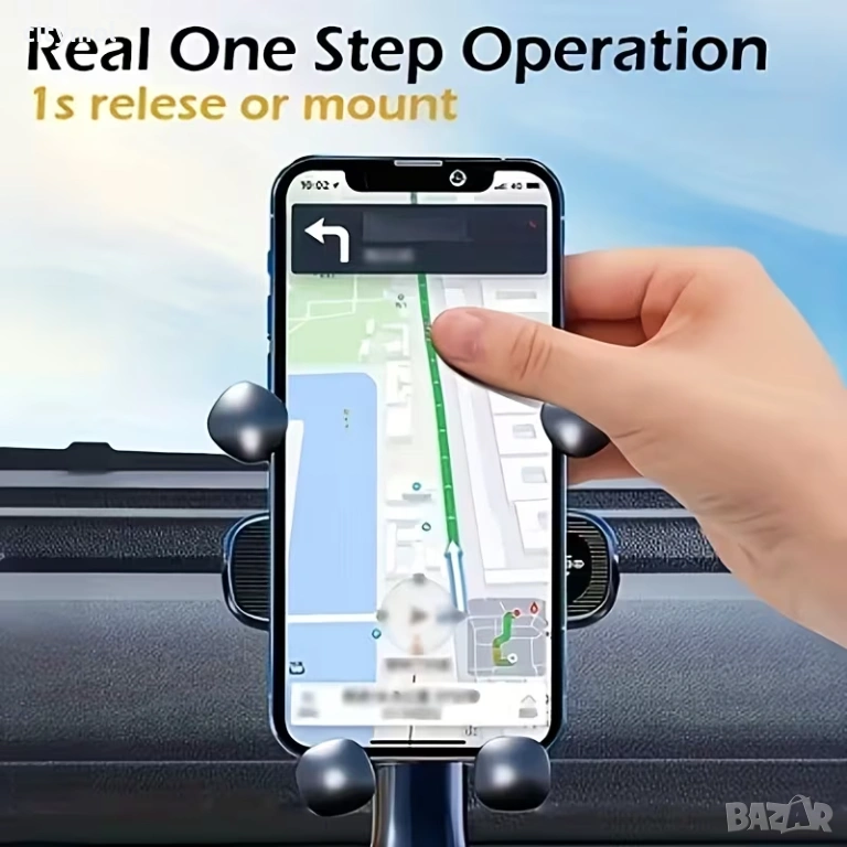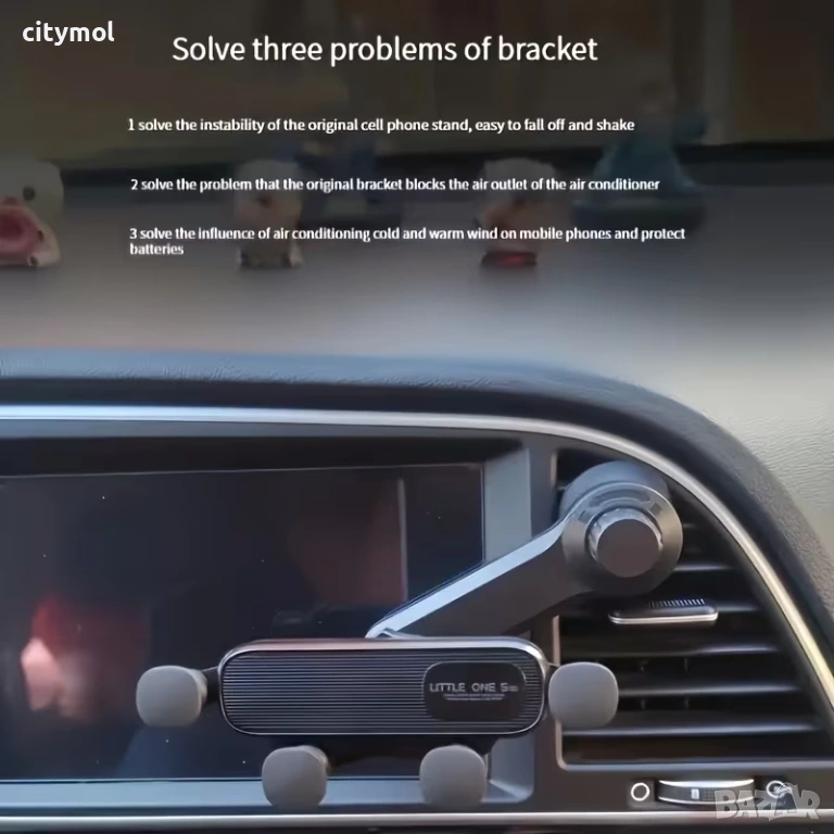 Механизмът осигурява надеждна работа за дълъг период от време. Държачът се монтира на вентилационните отвори на автомобила, което означава, че не заема място на предното стъкло и не разсейва водача. Подходящ е за повечето телефони.
