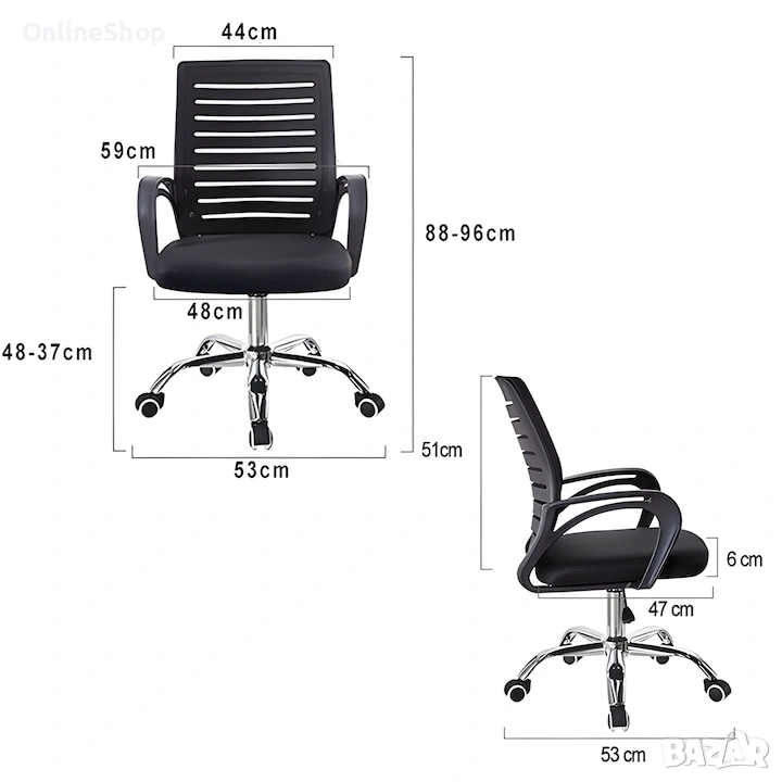 Ширина облегалка: 45 cm; ширина седалка: 47 cm; дълбочина седалка: 48 cm.