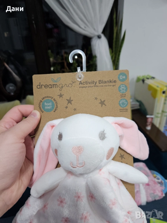 2. Заешко плюшено одеяло за занимания, бяло и розово - Dream Gro Rabbit Activity Blankie Plush Stuffed Animal White Pink Blanket