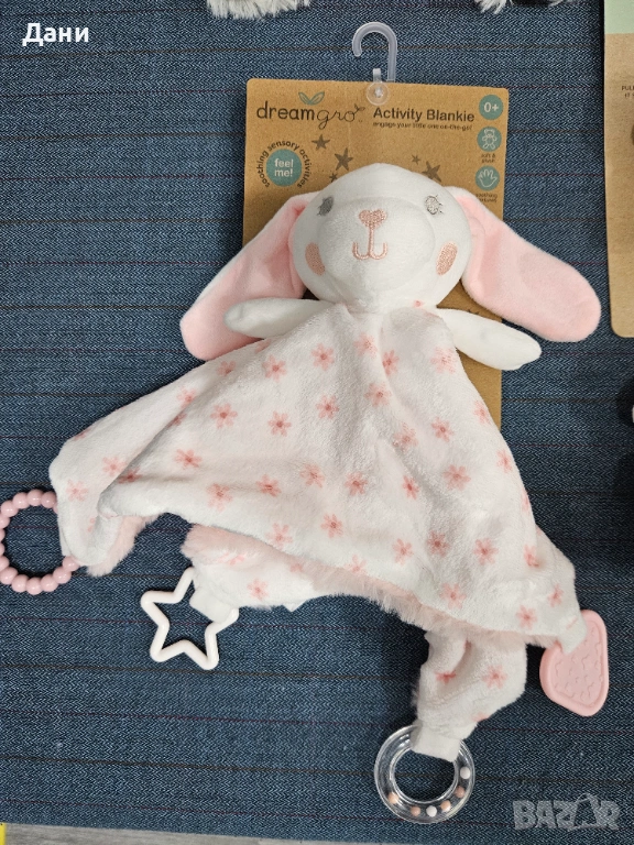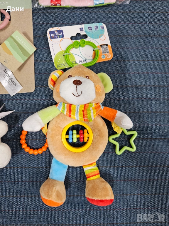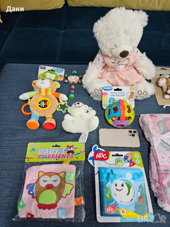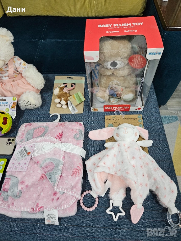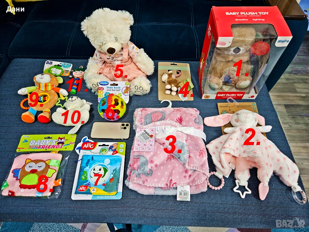 Продавам чисто нови бебешки играчки с етикетите - видра, мече, одеяло, плюшени играчки, дрънкалки и др.