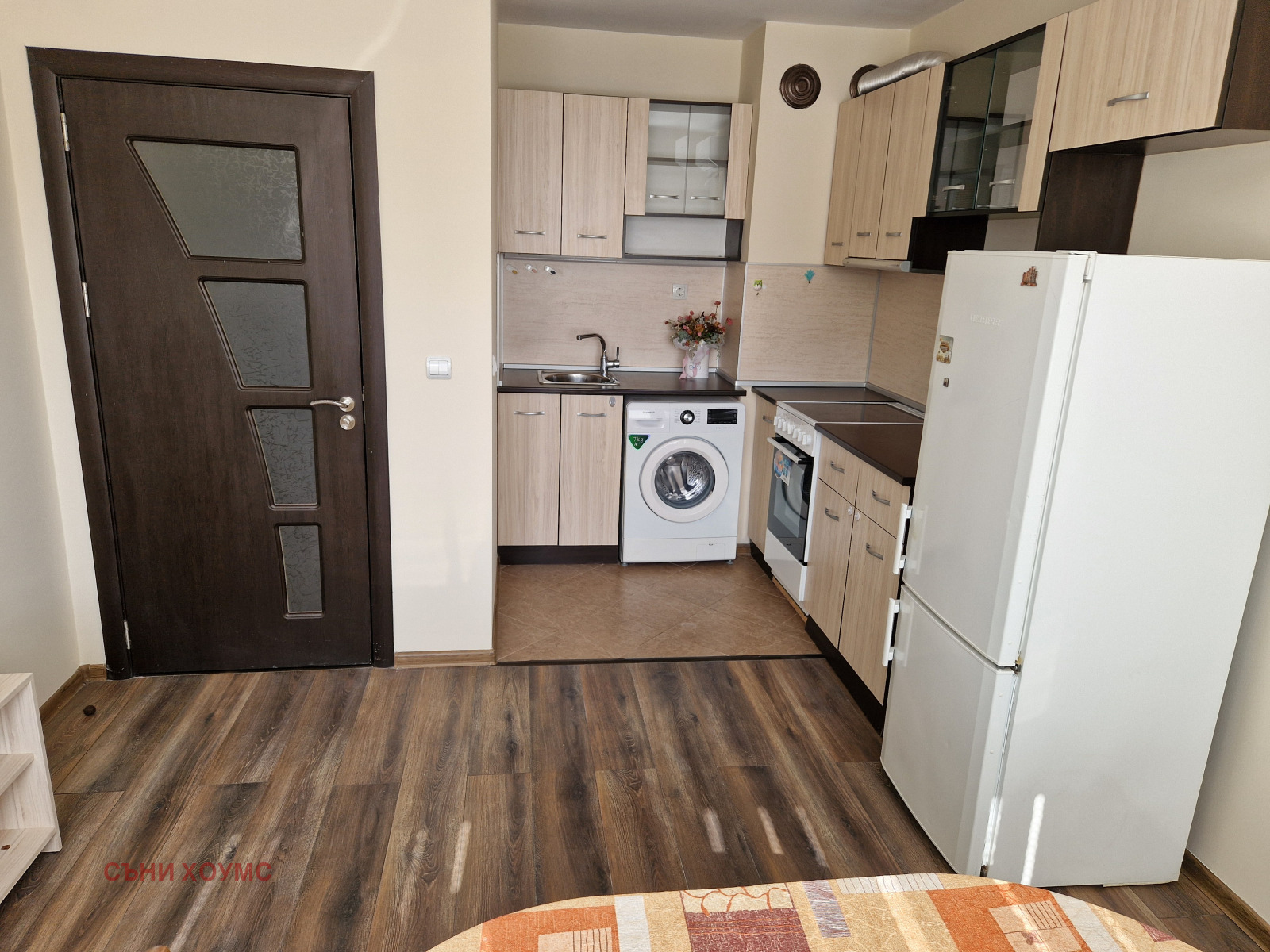 Разпределението на апартамента е както следва: дневна с кухня, спалня, баня с тоалетна, входно антре и тераса. Апартаментът е с южно изложение и отлична топлоизолация, която е гаранция за по-ниски сметки за електроенергия. Обзаведен е с нови мебели. В дневната има климатик, осигуряващи комфорт през цялата година. Налични са всички основни електроуреди, необходими за едно домакинство. В апартамента ще бъдат поставени и ъглов диван, в дневната, и нова спалня.
