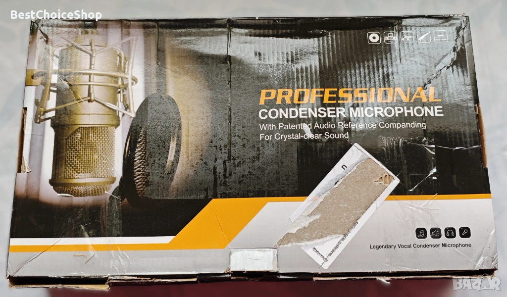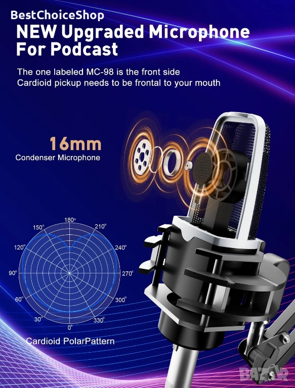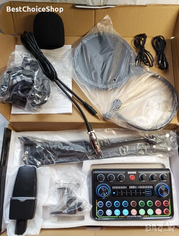 - Оборудване: Комплектът съдържа кондензаторен микрофон, стойка и професионален аудио миксер.